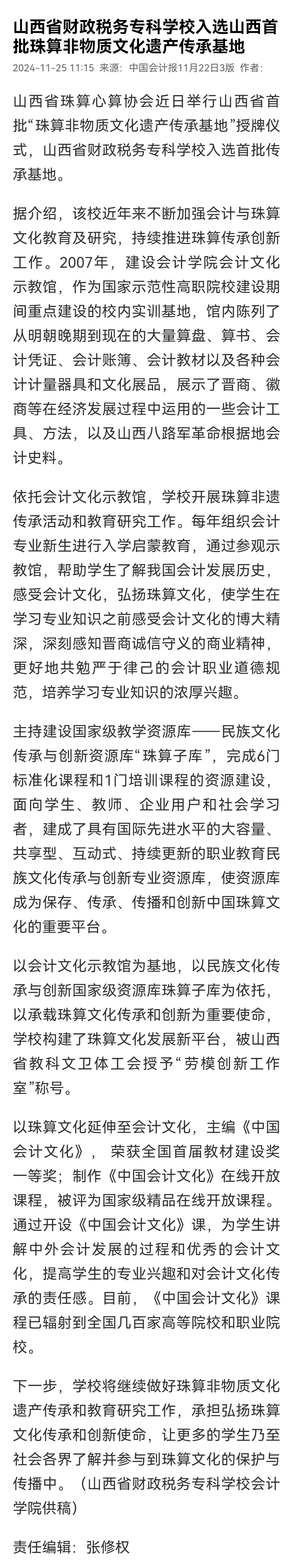 中国会计报:bat365入选山西首批珠算非物质文化遗产传承基地