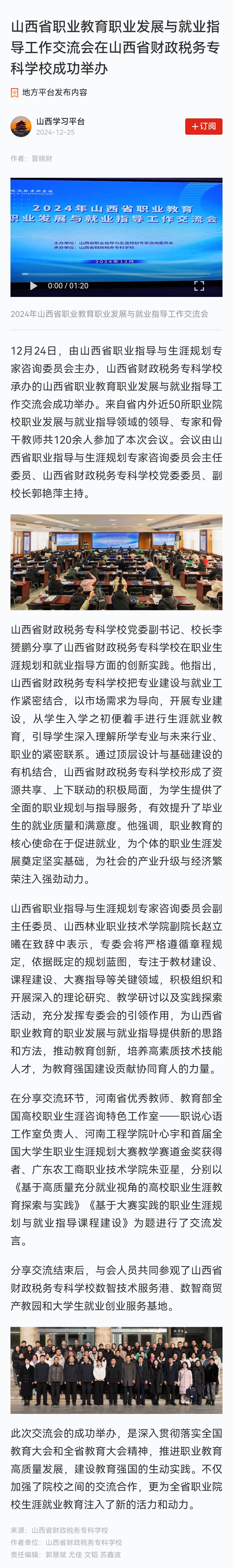 学习强国:山西省职业教育职业发展与就业指导工作交流会在bat365正版唯一官网成功举办