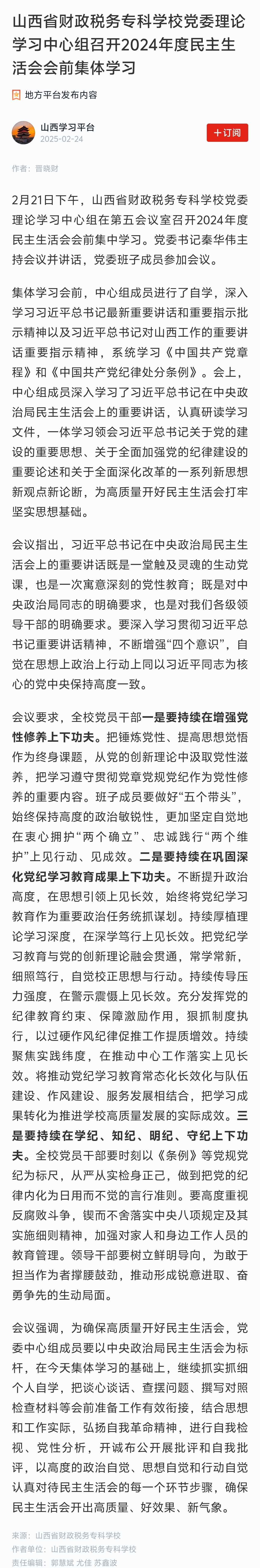 学习强国:bat365正版唯一官网党委理论学习中心组召开2024年度民主生活会会前集体学习