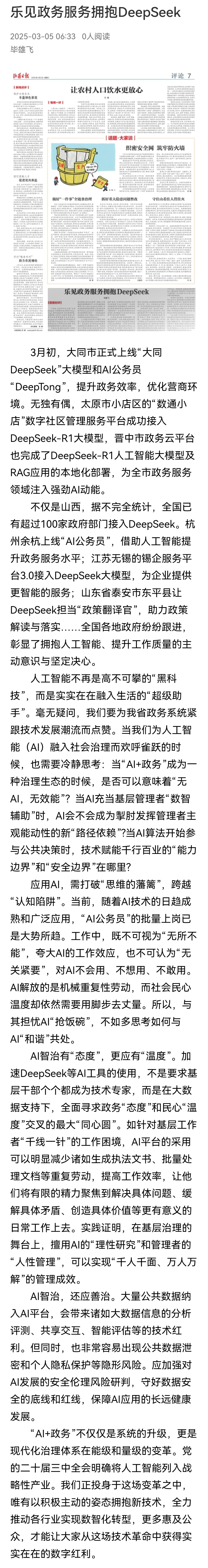 3月初,大同市正式上线“大同DeepSeek”大模型和AI公务员“DeepTong”,提升政务效率,优化营商环境。无独有偶,太原市小店区的“数通小店”数字社区管理服务平台成功接入DeepSeek-R1大模型,晋中市政务云平台也完成了DeepSeek-R1人工智能大模型及RAG应用的本地化部署,为全市政务服务领域注入强劲AI动能。