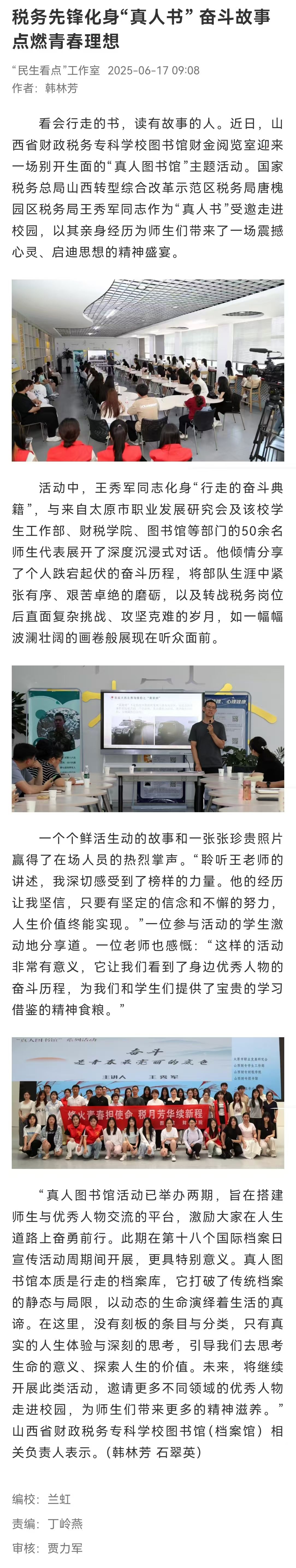山西日报:税务先锋化身“真人书” 奋斗故事点燃青春理想