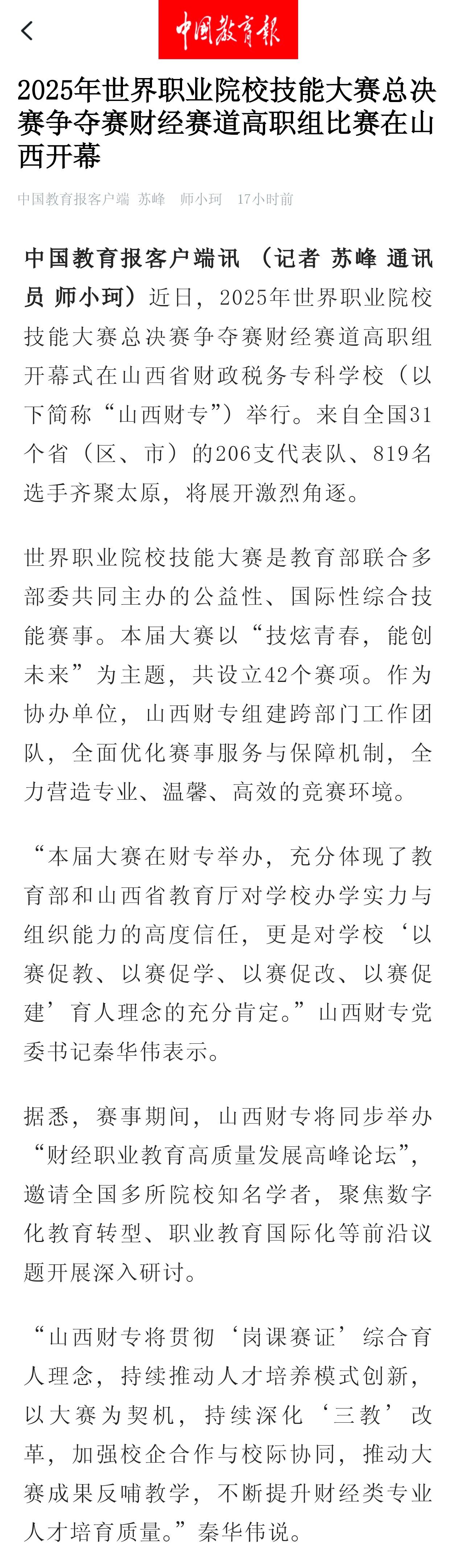 中国教育报:2025年世界职业院校技能大赛总决赛争夺赛财经赛道高职组比赛在山西开幕