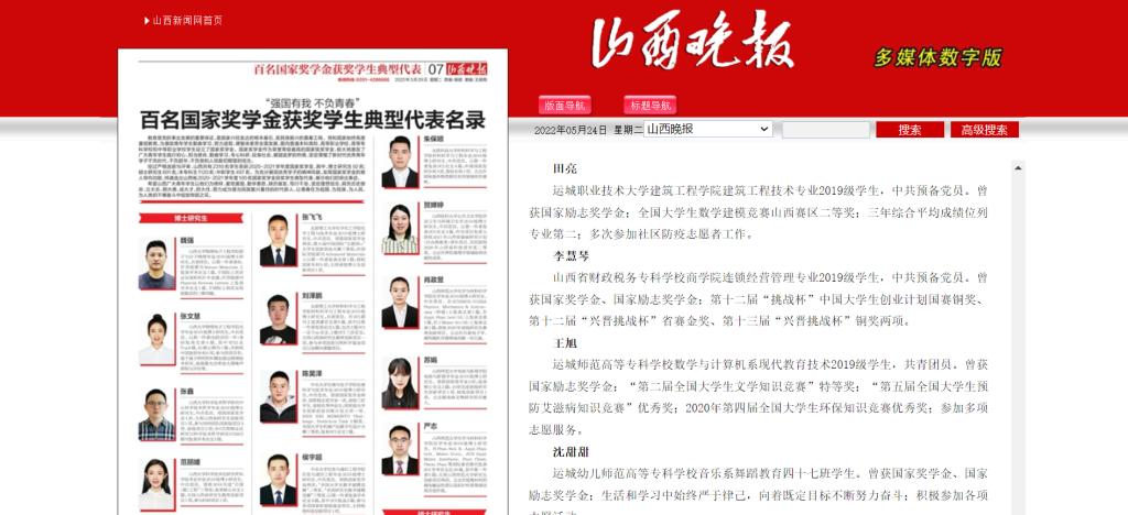 山西晚报:山西百名国家奖学金获奖学生典型代表名录