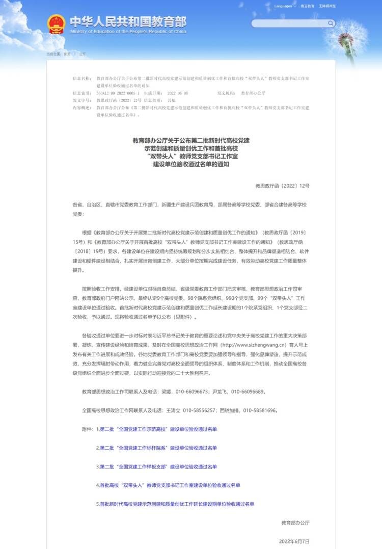 教育部办公厅:教育部办公厅公布《第二批新时代高校党建示范创建和质量创优工作和首批高校“双带头人”教师党支部书记工作室建设单位验收通过名单》