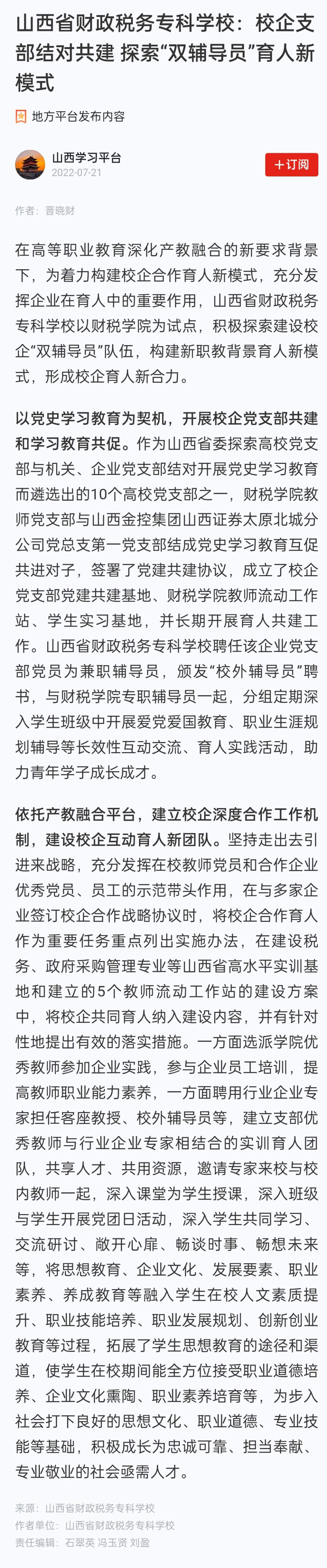 学习强国:bat365校企支部结对共建 探索“双辅导员”育人新模式