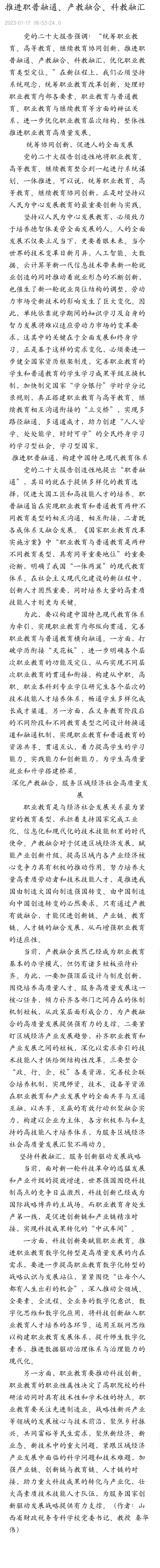党的二十大报告强调:“统筹职业教育、高等教育、继续教育协同创新,推进职普融通、产教融合、科教融汇,优化职业教育类型定位。”在新征程上,我们必须坚持系统观念,统筹职业教育改革创新,处理好职业教育内部各要素、职业教育与普通教育、职业教育与继续教育等方面的辩证关系,进一步优化职业教育层次结构,整体性推进职业教育高质量发展。