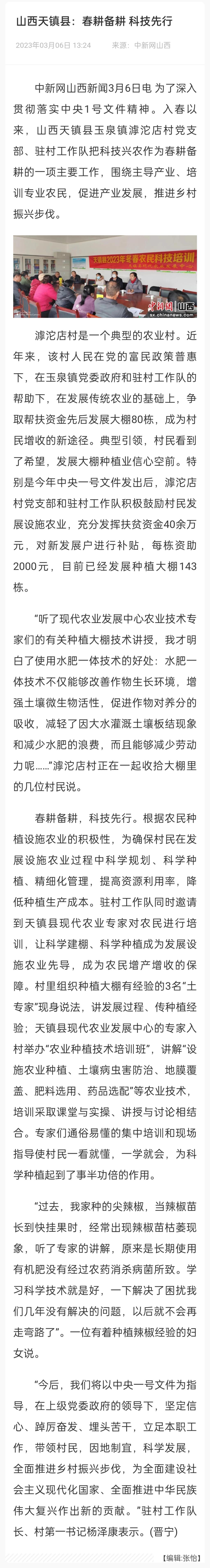 中新网山西新闻3月6日电 为了深入贯彻落实中央1号文件精神。入春以来,山西天镇县玉泉镇滹沱店村党支部、驻村工作队把科技兴农作为春耕备耕的一项主要工作,围绕主导产业、培训专业农民,促进产业发展,推进乡村振兴步伐。