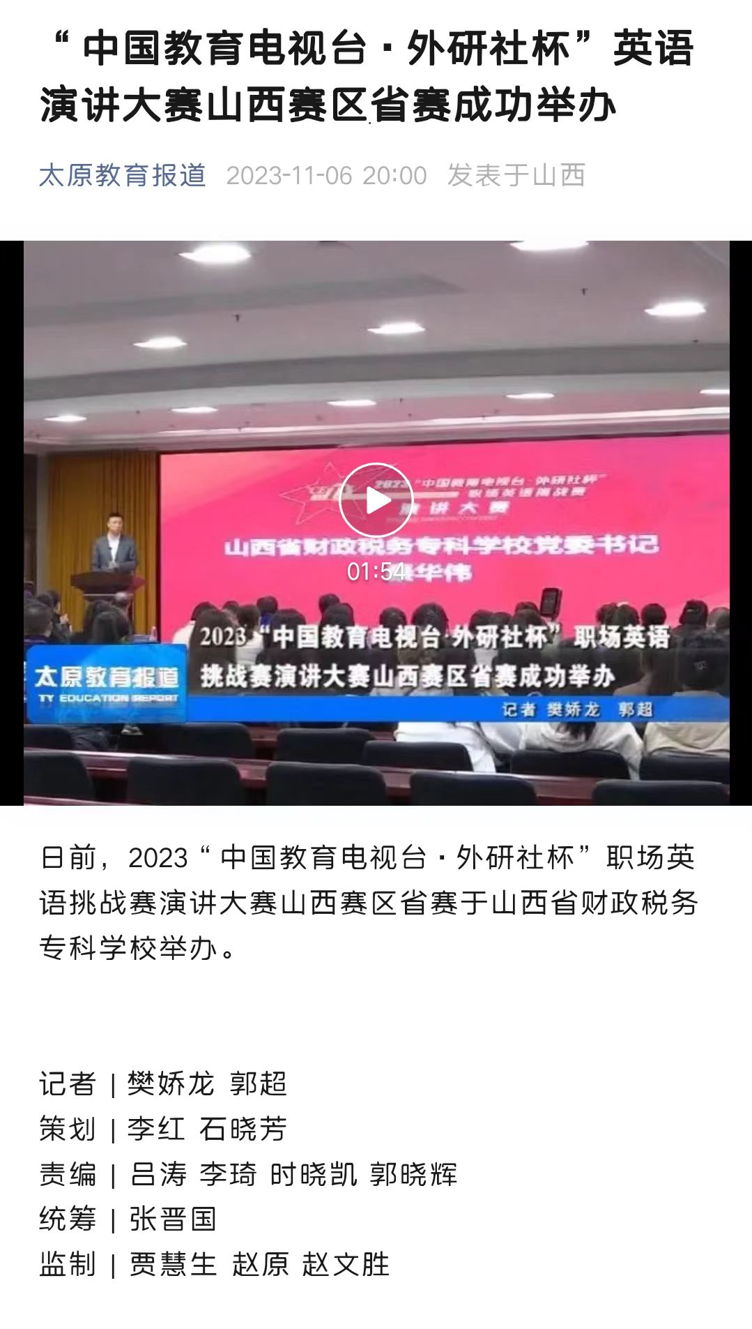 太原教育日报:“中国教育电视台·外研社杯”英语演讲大赛山西赛区省赛成功举办