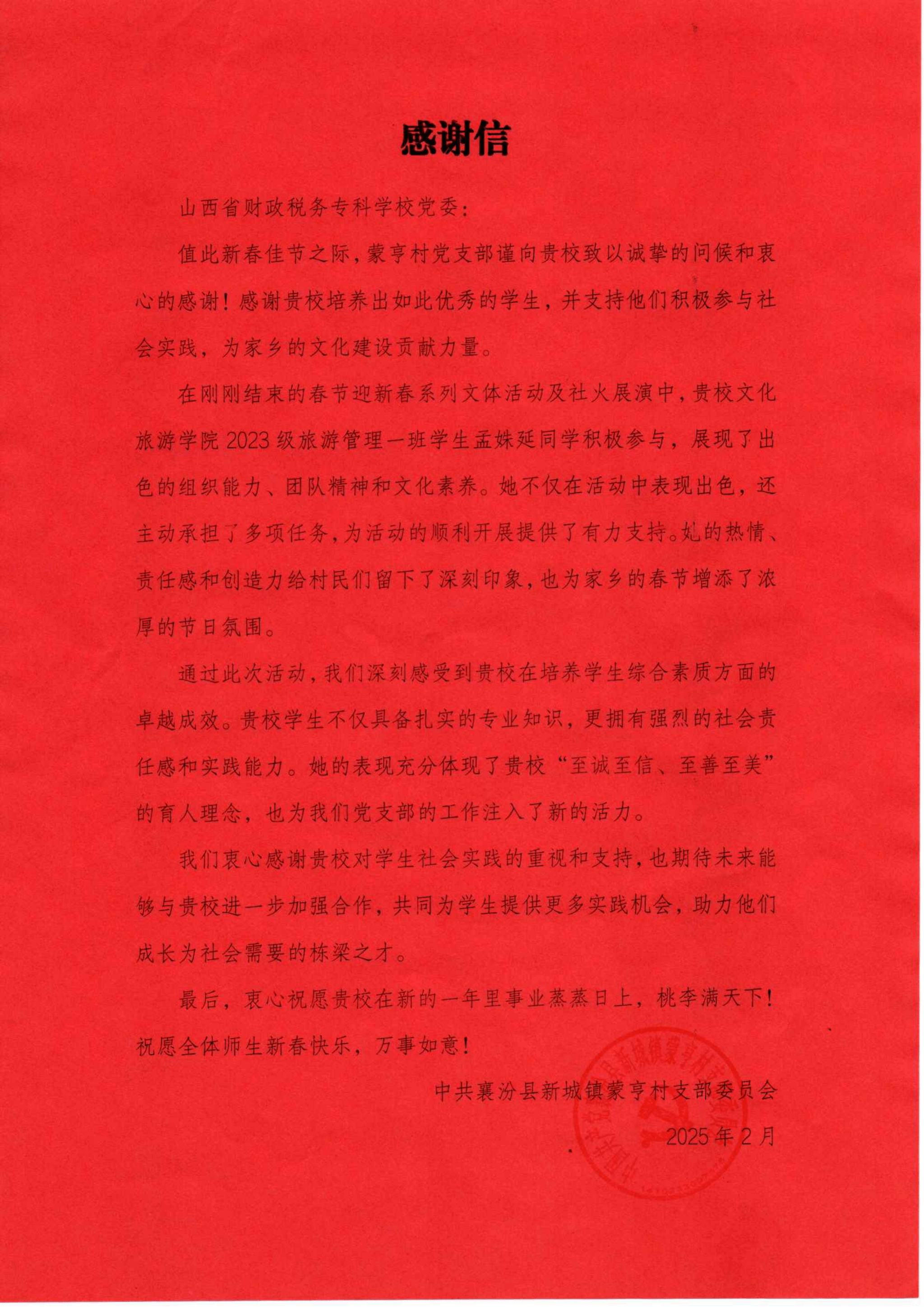 2月27日,bat365收到一封来自中共襄汾县新城镇蒙亨村支部委员会的感谢信。信中,蒙亨村党支部对bat365文旅学院2023级旅游管理一班学生孟姝延在春节期间组织参与家乡迎新春系列文体活动及社火展演中的出色表现给予了高度赞扬,并对bat365在学生综合素质培养和乡村振兴社会实践方面的卓越成效给予充分肯定。