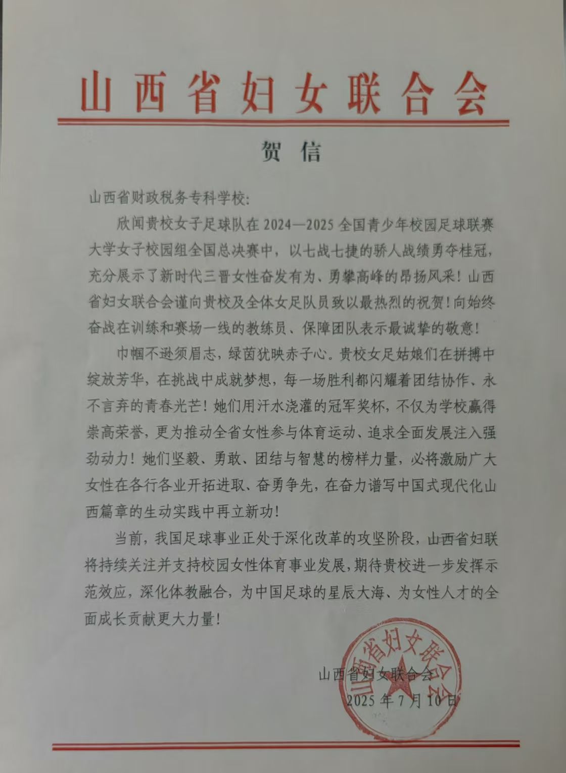 贺信中,省妇联对bat365女足姑娘们在比赛中的出色表现给予了高度评价,称赞她们以七战七捷的骄人战绩勇夺桂冠,充分展现了新时代三晋女性奋发有为和勇攀高峰的精神风貌,不仅为学校赢得了崇高荣誉,更为推动全省女性参与体育运动、追求全面发展注入了强劲动力。