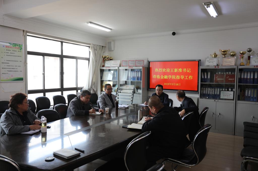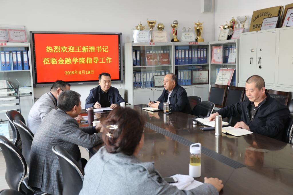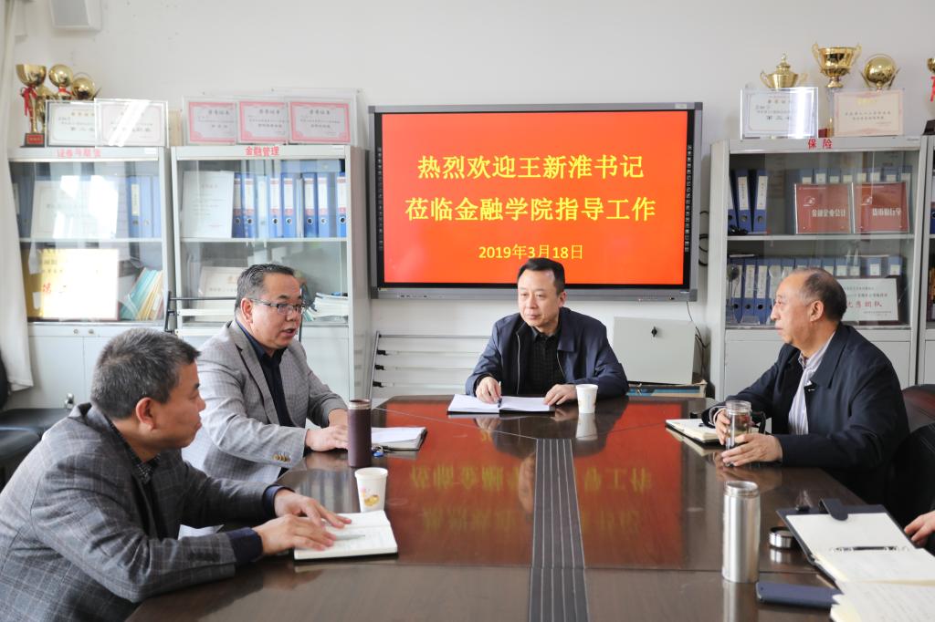 3月18日下午,校党委书记王新淮深入金融学院调研指导工作,校党委委员、学校办公室主任董国富陪同调研。金融学院党政班子成员参加了调研座谈会。