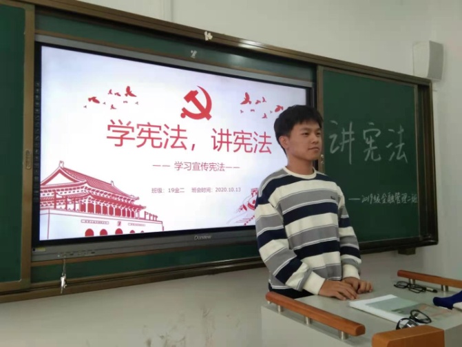 金融学院18个班共计851名学生在网络上参加了“学宪法讲宪法”活动,在网络上完成了练习作业。同时各班学生也开展了学习宪法的法制教育主题班会活动,引导学生尊法、学法、守法、用法,扣好人生第一粒扣子。让同学们知道《宪法》作为国家根本大法的重要性,依法治国的根本理念、明白作为社会的公民,遵纪守法是基本要素。在主题班会中,各班主任组织本班同学开展讨论和讲解,活动在轻松愉快的氛围中圆满结束。
