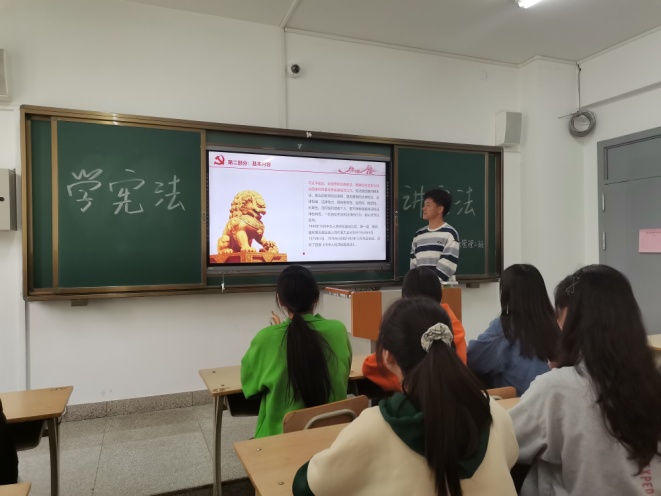 活动中,各班以班级为单位,以班主任的宪法普及拓展为指导,开展了形式多样的主题活动,在“学宪法讲宪法”活动中,同学们了解了当前大学生违法犯罪的现状、特点、成因,以及容易受到的诱惑和如何防范,提高大学生分辨是非能力,引导大学生树立正确的人生观、价值观、世界观,养成遵纪守法好习惯。同时运用生动鲜活的案例,介绍了网瘾、校园暴力、校园欺凌、网络安全等各类与校园安全息息相关的法律内容,为保护当代大学生竖起一座坚固的防火墙。