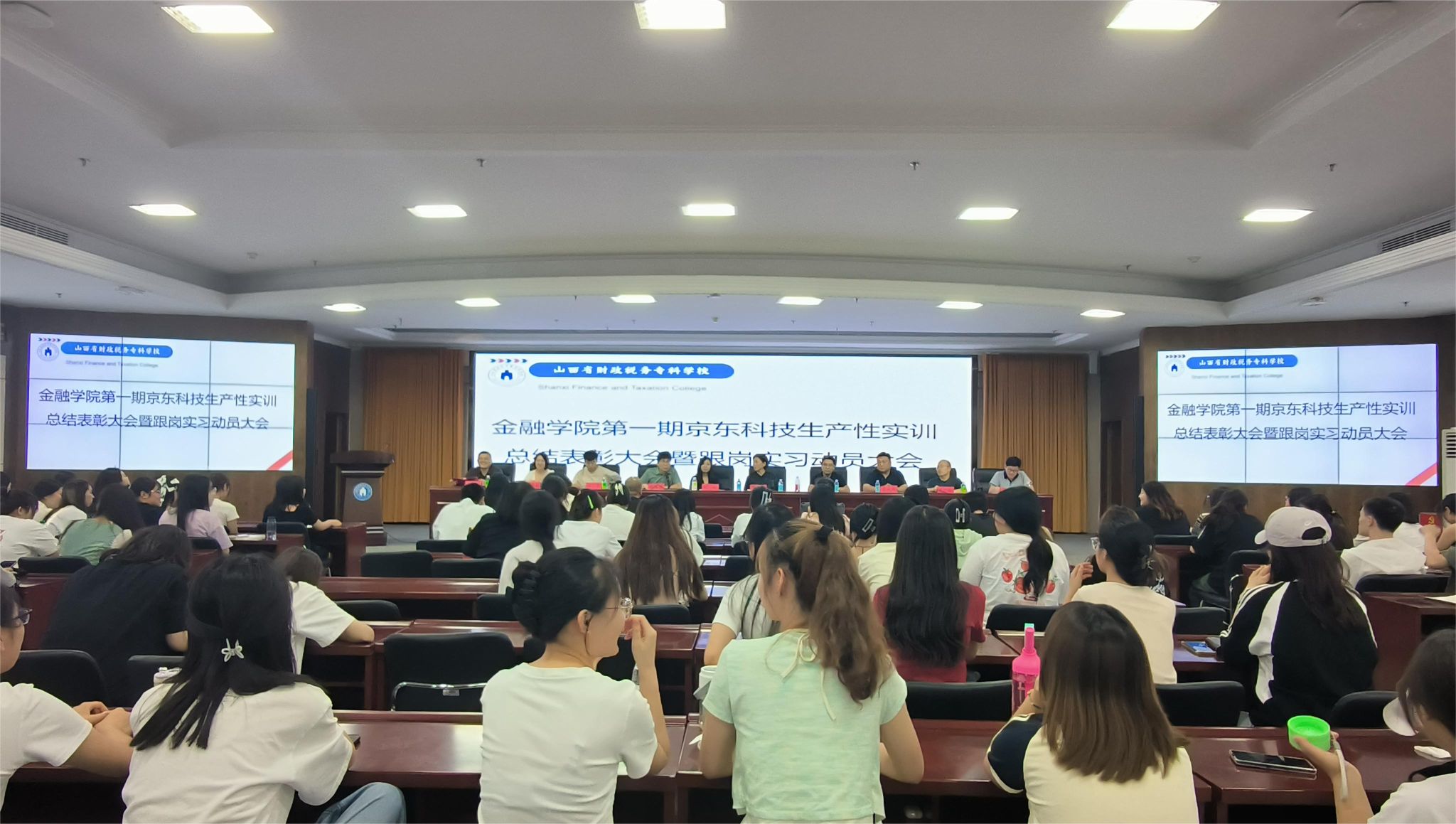 2024年6月25日,金融学院第一期京东生产性实训总结表彰大会暨跟岗实习动员大会在实训楼七楼会议室举行,京东科技行政总监胡扬、京东科技山西分中心业务负责人袁芳、京东科技山西分中心校企运营负责人岳盟,金融学院所有班子成员、教研室主任和2022级金融服务与管理专业、金融科技应用专业的所有学生参加了会议,金融学院行政负责人宋陆军主持。
