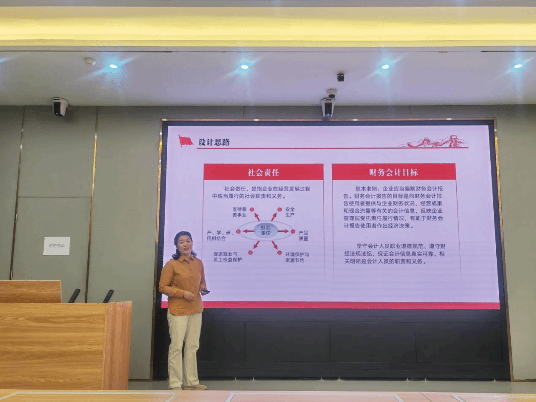郑红梅老师强调,《企业财务会计》课程以《企业会计准则》为基础,将财务会计目标与社会责任紧密结合。结合财政部2024年发布的《企业可持续披露准则——基本准则(试行)》,课程明确社会责任报告作为企业非财务报告的重要性,引导学生认识到信息披露对树立品牌形象、推动可持续发展的长远意义。课程教学目标聚焦“立德树人”,致力于培养学生坚守会计职业道德、服务国家发展的能力,实现知识传授、价值塑造与能力培养的统一。课程内容设计环节,郑红梅老师将会计要素与思政要点一一对应,课程融入我国会计准则体系发展历程,激发学生的职业认同感与民族自豪感。案例讲解环节,郑老师结合“研发费用”的会计处理,讲述了太钢集团在李克强总理提出“圆珠笔头之问”后,攻克技术难关,成功研发出圆珠笔头球座体所用的“超易切削钢丝”,打破了我国圆珠笔头原材料依赖进口的局面,深刻诠释了“创新是企业灵魂”的理念,引导学生理解研发投入对增强核心竞争力、实现产业升级的重要性。郑红梅老师指出,未来会计人才不仅需掌握会计准则,更要具备诚信为本的职业操守、服务社会的大局意识及推动可持续发展的战略眼光。