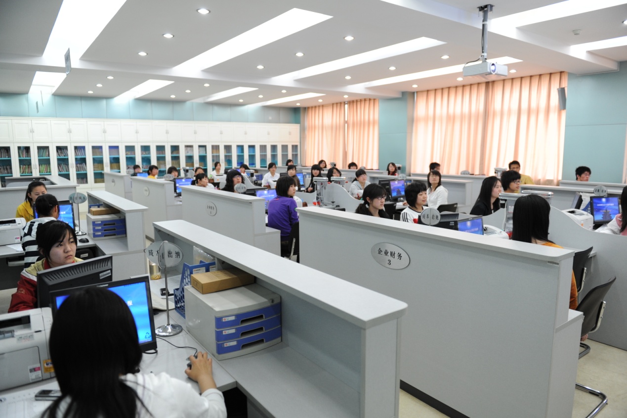 多功能实训室:手工模拟会计业务处理,利用网中网会计实训系列软件电子模拟会计业务处理,利用用友U8财务软件进行会计电算化实训,利用金蝶ERP电子沙盘进行企业全面运营电子对抗演练,采用小键盘票据录入训练软件进行小键盘票据录入实训。