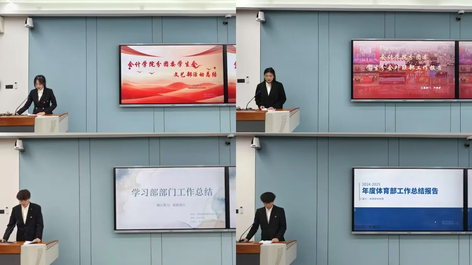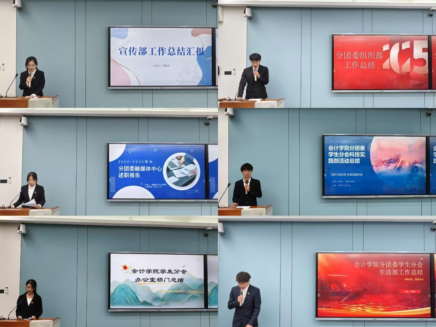 会议第二项,分团委学生分会各部门负责人依次上台进行工作总结汇报,围绕部门核心职能,通过详实的数据统计、生动的图文展示了本部门在思想引领、校园文化、服务同学等领域的工作成效,共同勾勒出我院师生促进校园文化发展的图景。同时也认真剖析了工作当中存在的问题,并针对问题提出了切实可行的改进措施,包括增强团队协作、精简工作流程,提前规划协调等,旨在共同致力于推动学院分团委工作向高质量方向发展。