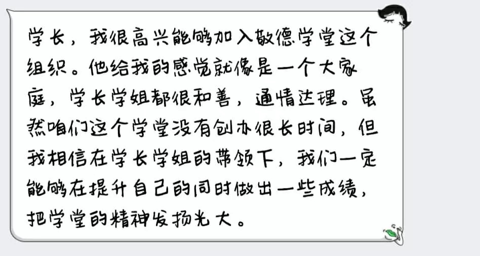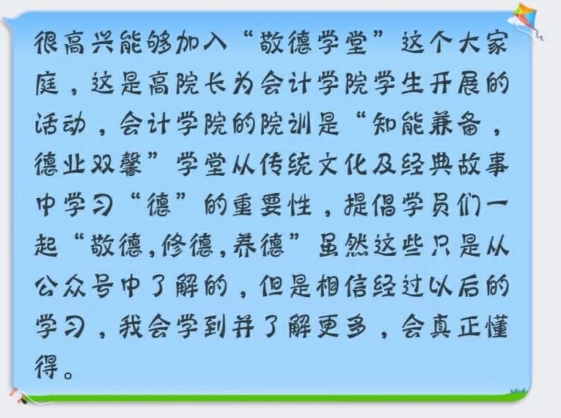 为使敬德学堂在加入新鲜血液后有更好的发展,使大家通过两周一次的学习活动,能够长期坚持敬德、明德和修德,班长还为大家布置了课后小作业询问大家加入敬德学堂的初衷以及对敬德学堂授课模式的建议和看法,希望新学员们能够更好地融入敬德学堂大家庭,真正学有所获,真正把敬德落到实处。