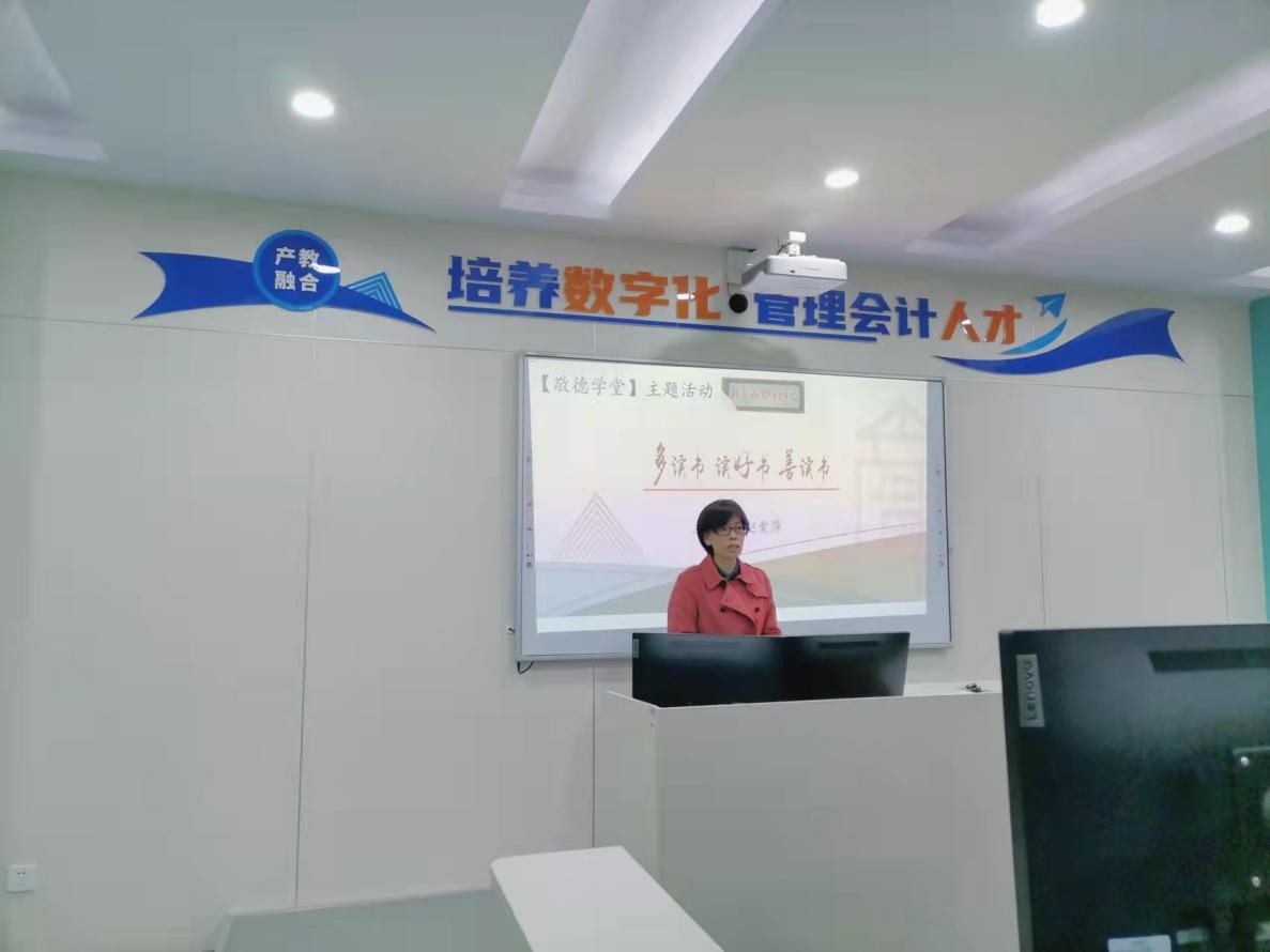 2023年4月1日,会计学院励志会计专业协会“敬德学堂”在一号教学楼509教室开展第三十六讲。4月23日是世界读书日,4月是我国的全民读书月,为鼓励同学们养成好读书、读好书的阅读习惯,我院教师党支部赵爱萍老师为同学们讲授《多读书、读好书、善读书》。