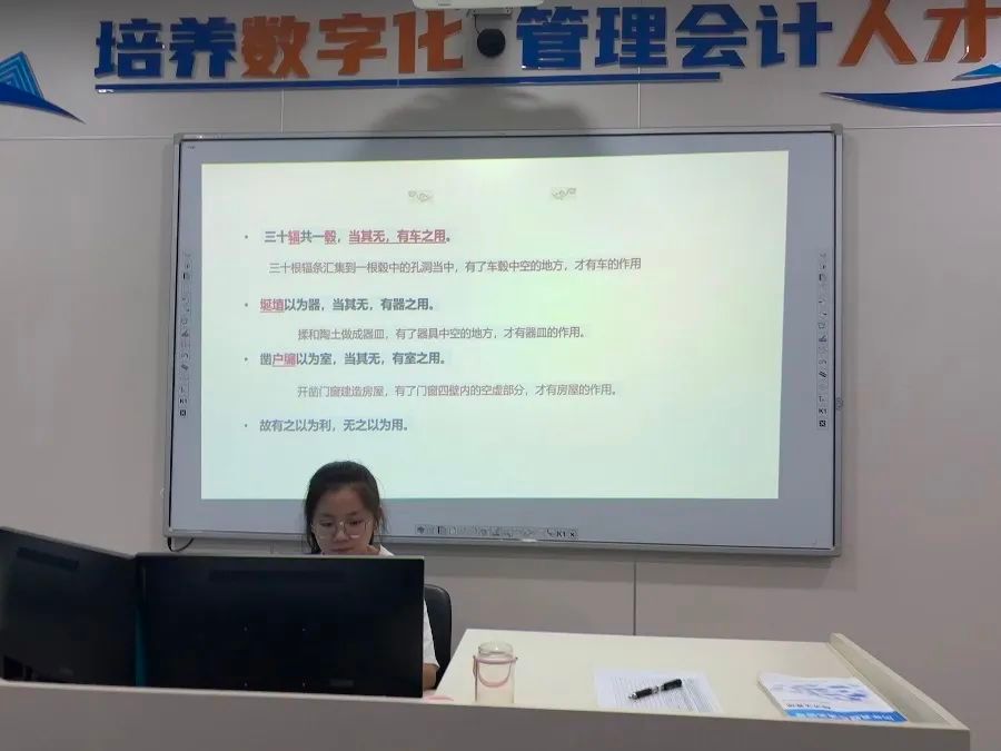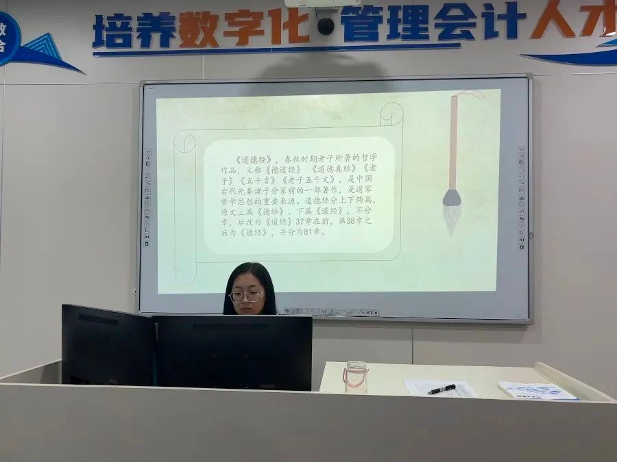 2024年4月13日晚,会计学院励志会计专业协会“敬德学堂”在一号教学楼509教室开展第55讲。敬德学堂全体成员共46人参加了本次课程,主题为《道德经》;此次课程由吕珺、史永晓、甄宁这三位同学给大家分享自己对《道德经》中“美”的理解,同学们感悟深刻,事物皆有两面性,事物的发展有其自身的规律,所以我们要学会辩证地看待问题。