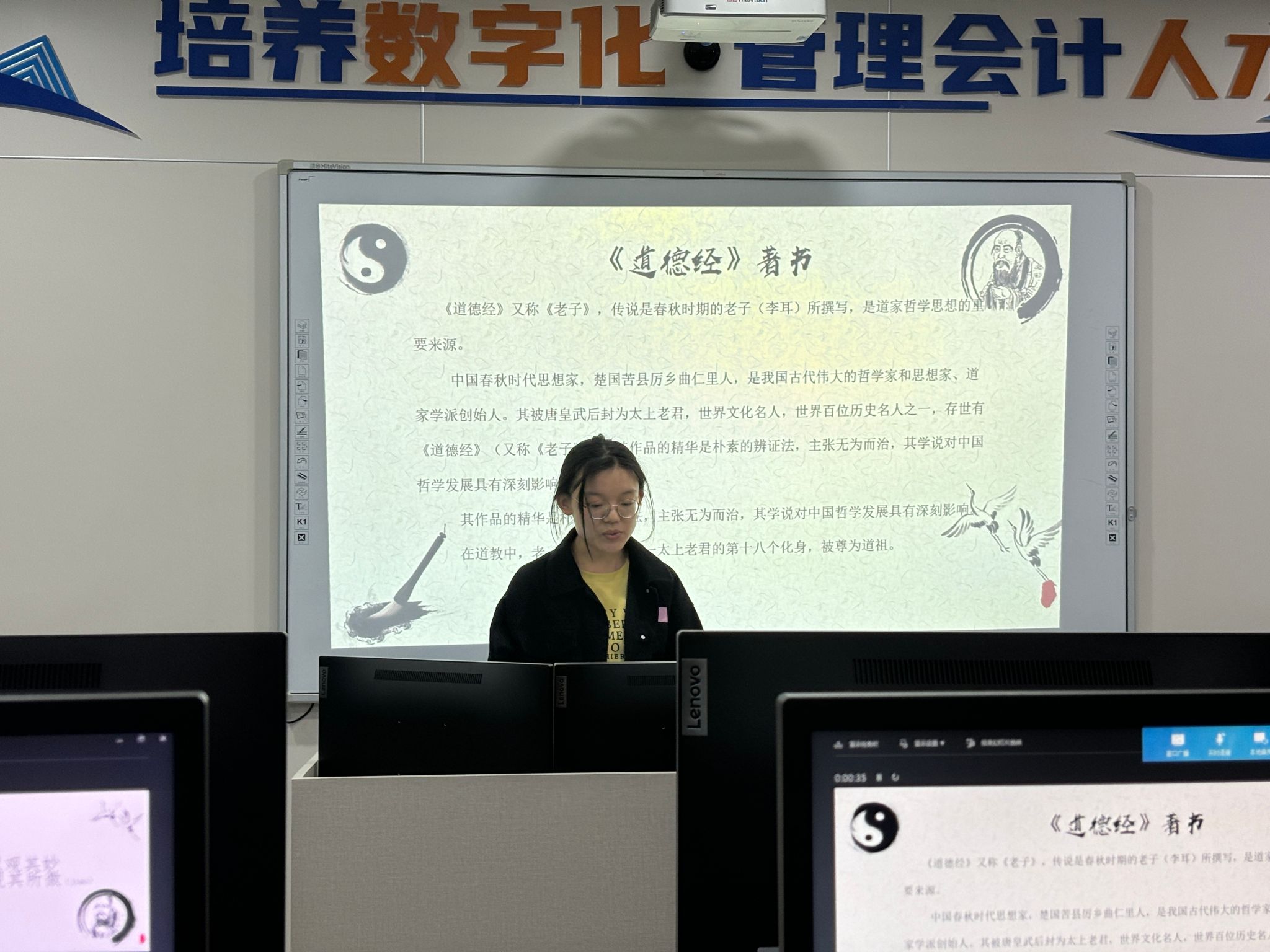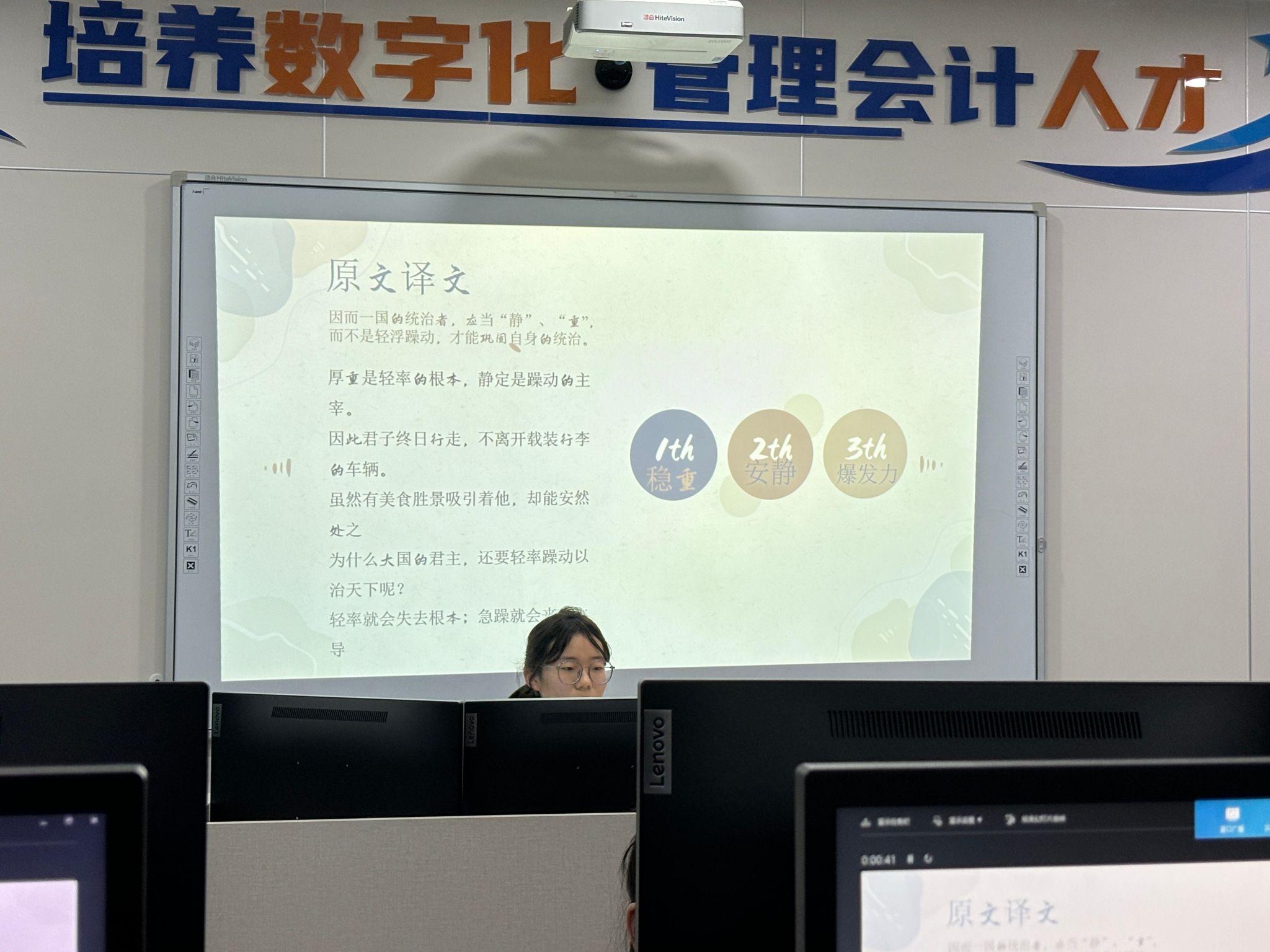 2024年4月27日晚,会计学院励志会计专业协会“敬德学堂”在一号教学楼509教室开展第五十六讲。敬德学堂全体成员共46人参加了本次课程,主题为《道德经》;此次课程由刘艺、孟钦爽、闫佳颖这三位同学给大家讲解《道德经》中的“轻则失根,躁则失君”。