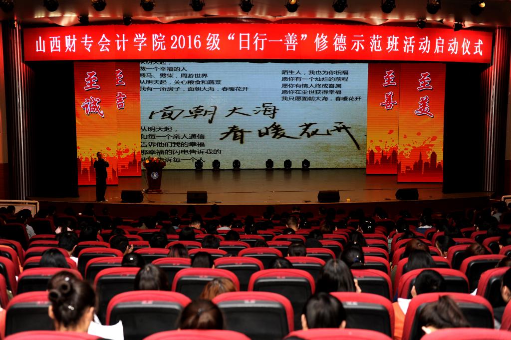 3月21日下午,会计学院在会堂举办2016级“日行一善”修德示范班活动启动仪式。本次活动是继去年学院与厦门网中网软件有限公司合作举办“日行一善”活动的延续。校领导赵丽生校长,会计学院高翠莲院长、王俊龙书记、董京原副院长,会计学院办公室张中元主任,校团委范文君老师及厦门网中网软件有限公司张奋志经理和公司文化顾问丰收导师出席活动。