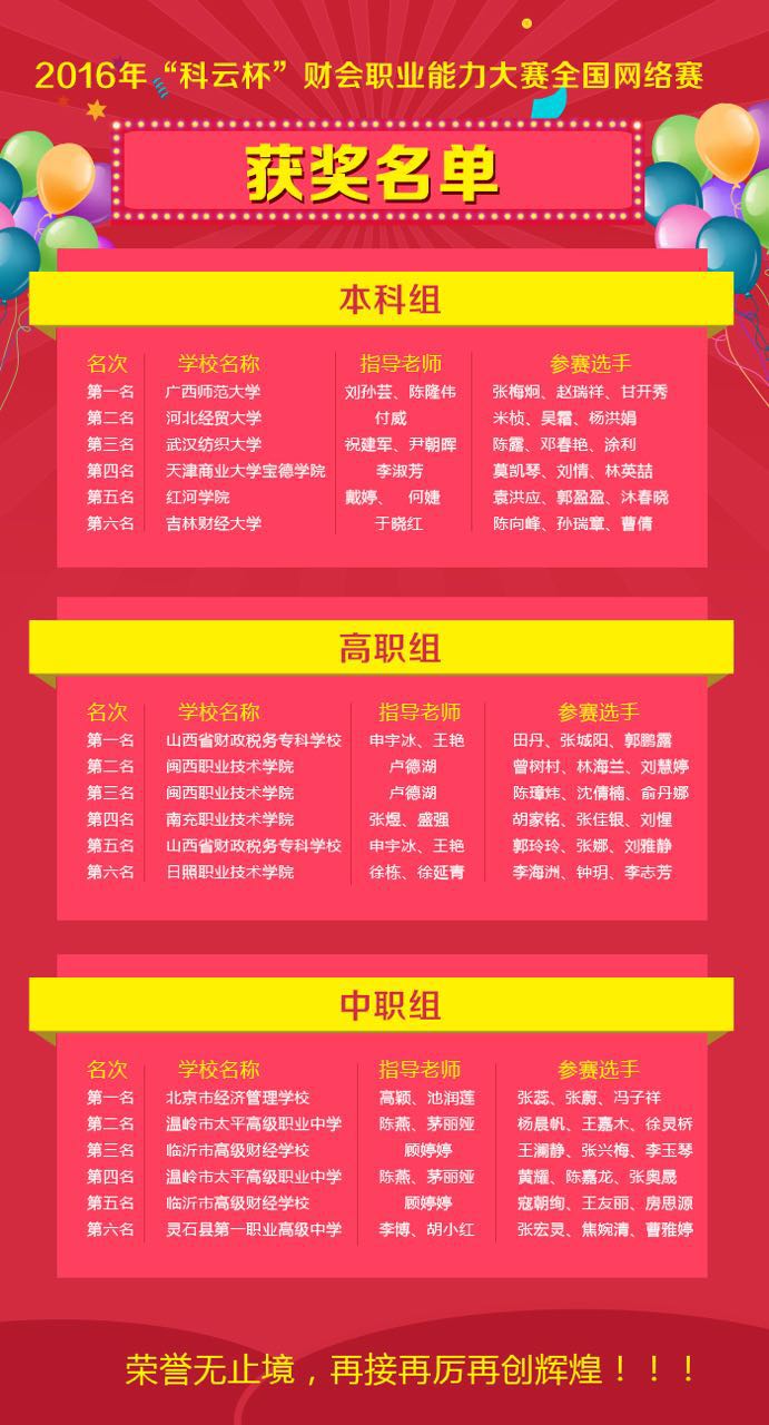 日前,历时两个多月的2016年全国高校商业精英挑战赛“科云杯”财会职业能力竞赛圆满结束。bat365会计学院选拔组队的参赛选手:田丹、张城阳、郭鹏露取得高职组第一名的优异成绩,bat365会计学院选拔组队的参赛选手:郭玲玲、张娜、刘雅静取得高职组第五名的优异成绩,两支参赛队伍荣获“科云杯”财会职业能力竞赛全国网络赛一等奖。王艳、申宇冰两位指导教师被组委会授予“优秀指导老师”称号。