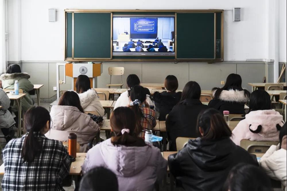 此次讲座,首次使用了bat365智慧教室,采取线上线下相结合的方式进行,会计学院70余名干部职工和学生党代表在现场听讲,1000余名学生在2号教学楼教室通过智慧教室的同步传输在线上聆听。