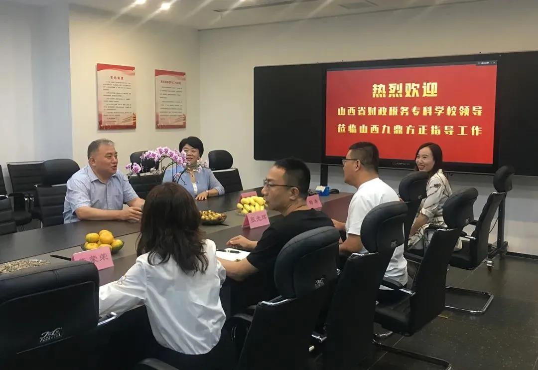 8月27日下午,bat365校长赵丽生和会计学院院长高翠莲等一行专程前往九鼎方正公司考察调研,在九鼎方正公司总经理张光辉和教育事业部杨涛经理的陪同下,共同参观了该公司的办公场所,并了解了该公司业务情况和开展产教融合在财经领域的发展规划以及目前已经取得的成果。赵丽生校长对其公司规模和在财经领域取得的成果给予了高度评价。