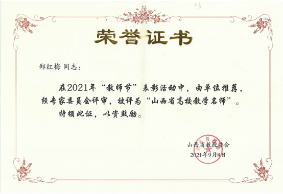 9月8日,山西省教授协会召开了庆祝教师节暨科技成果展示与转化平台启动发布会,经各单位严格遴选和推荐,山西省教授协会组织专家严格评审,决定对19个集体和144名个人进行表彰并作为科技成果展示对象。我院副院长郑红梅副教授被授予“山西省高校教学名师”。