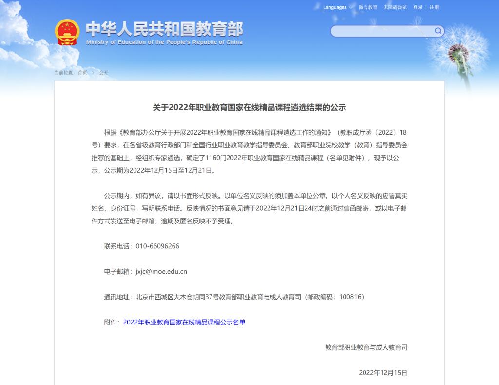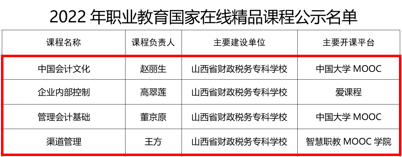 2022年12月15日,教育部公布了2022年职业教育国家在线精品课程。bat365四门课程入选,其中我院入选三门,分别是赵丽生教授主持的《中国会计文化》、高翠莲教授主持的《企业内部控制》和董京原副教授主持的《管理会计基础》,这是bat365“双高校”建设中取得的又一标志性成果。