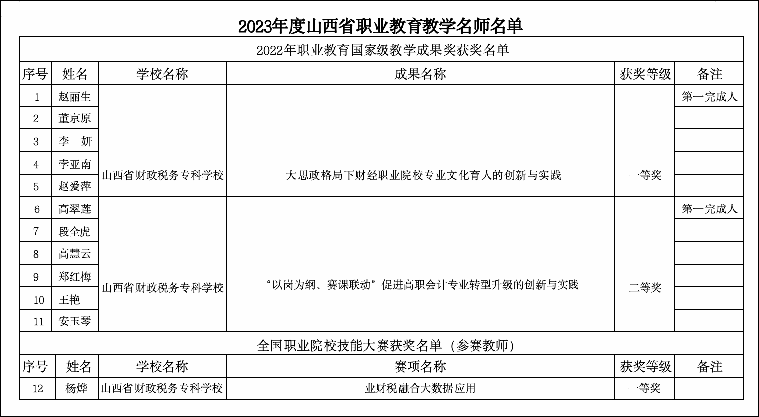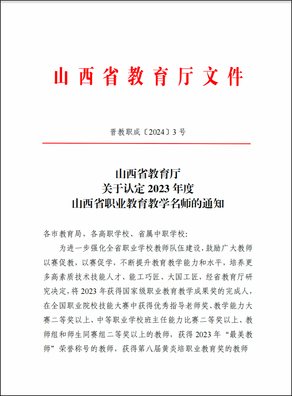 近日,省教育厅公布了2023年度职业教育教学名师名单,会计学院赵丽生、高翠莲等12位教师荣获2023年度山西省职业教育教学名师称号。