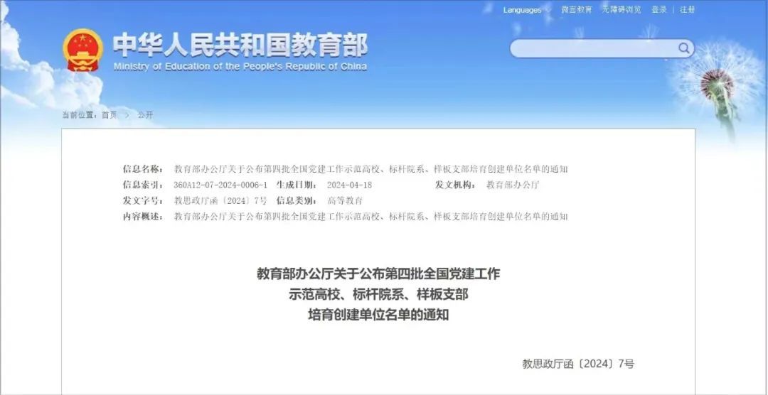 近日,教育部办公厅发布《关于公布第四批全国党建工作示范高校、标杆院系、样板支部培育创建单位名单的通知》(教思政厅函〔2024〕7号),我院教师党支部入选第四批“全国党建工作样板支部”培育创建单位。