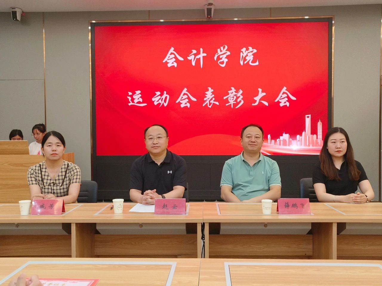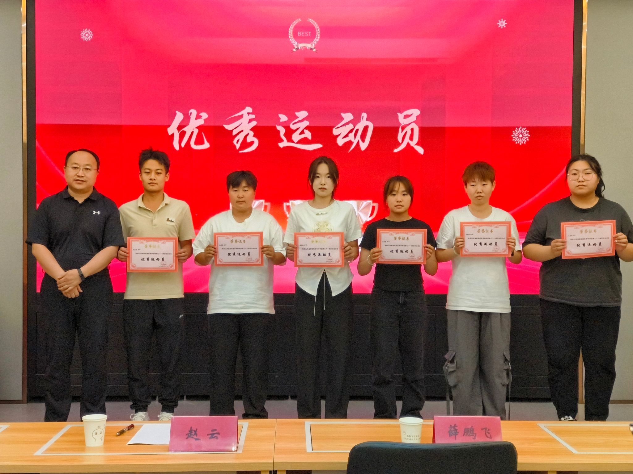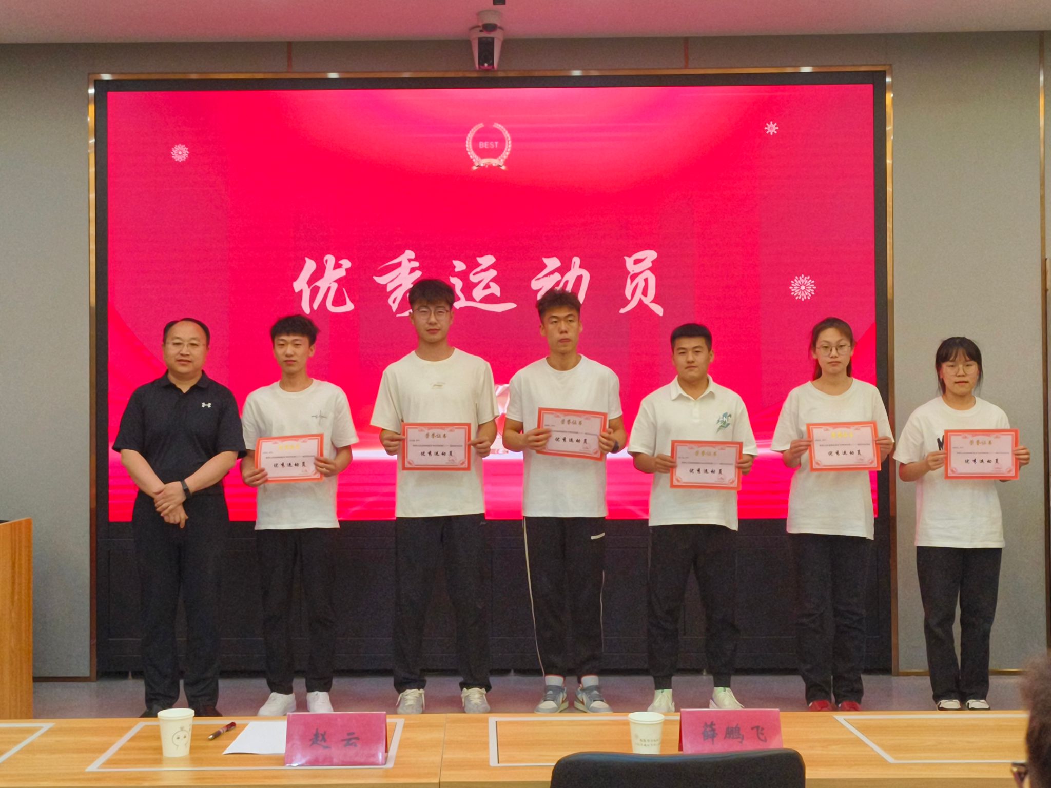 为弘扬“团结拼搏,奋勇向前”的运动精神,表彰我院学子在第三十一届校运动会上取得的好成绩,6月12日,我院在1号教学楼103教室召开“活动绽放光彩,运动彰显生命”为主题的运动会表彰大会,2023届全体运动员共同参与,我院党总支书记赵云老师、党总支副书记薛鹏飞老师、分团委副书记卢姝杰老师及分团委臧芳老师出席会议,并为受表彰学生颁奖。