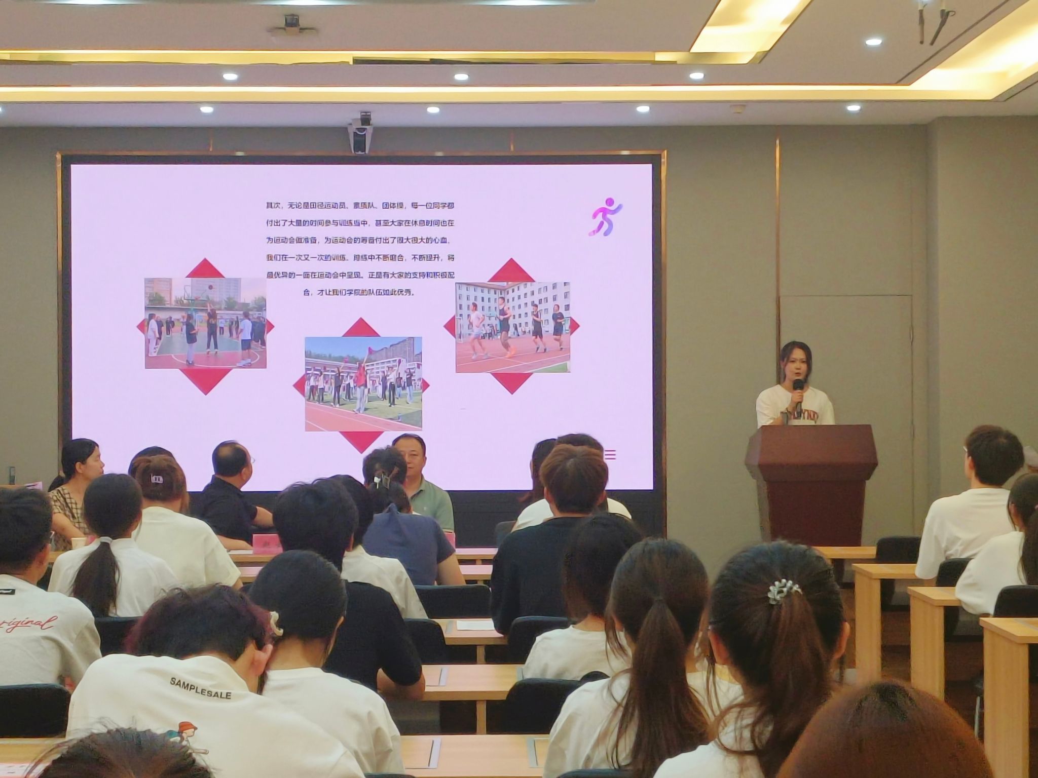 大会共同回顾了运动会赛场上大家共同拼搏的点点滴滴,运动员拼搏的身影再一次浮现到大家眼前,随后老师们为在运动会期间刻苦训练和夺得佳绩的同学颁发荣誉证书。学生分会体育部付译慧同学回顾了此次运动员的辛勤付出与比赛时的心路历程,争取在下一届运动会上取得更好的成绩。2023级大数据与会计二班廉滋樾作为运动员代表上台发言,分享了他在此次运动会中的经验所得,并表示未来将不断努力,奋力拼搏,突破自我。