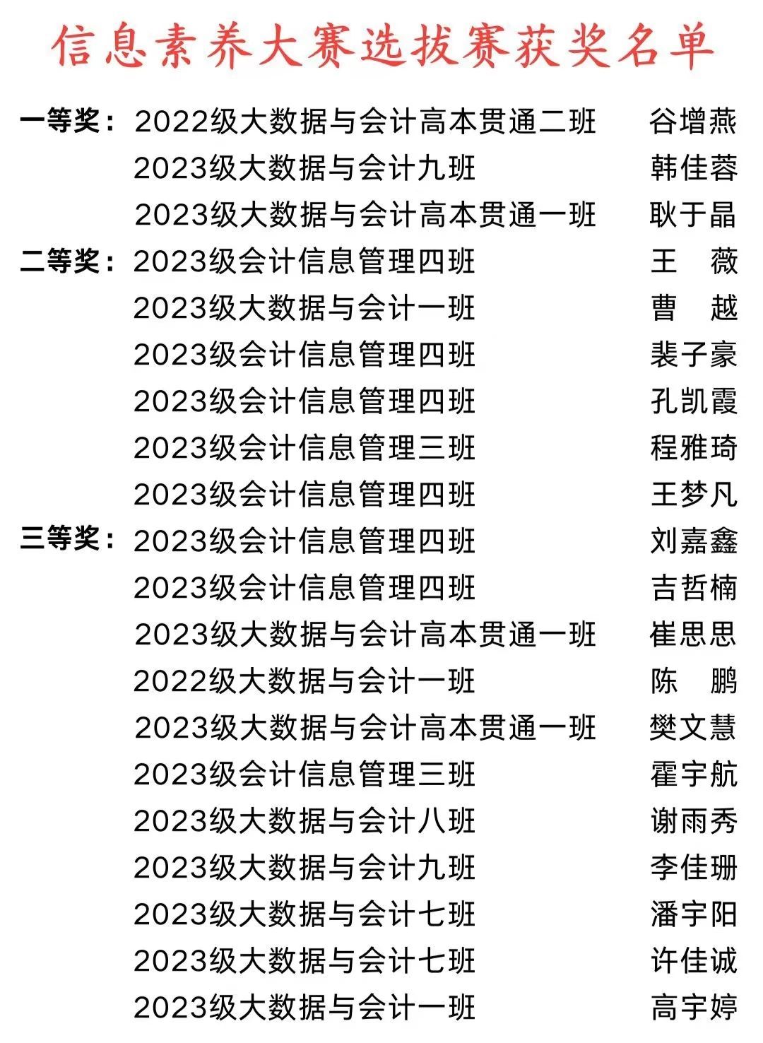 为提高我院学生信息素养和能力,促进信息素养教育全面健康发展,4月25日晚,我院在一号教学楼五层和八层教室组织开展信息素养大赛选拔赛,本次大赛由我院分团委学生分会和励志会计专业协会共同组织,共有276名同学参加,我院党总支书记赵云老师、党总支副书记薛鹏飞老师、专职辅导员臧芳老师、李雅欣老师出席大赛并担任评委,本次大赛按个人成绩及答题时长评选出一等奖3名、二等奖6名、三等奖11名。具体名单如下: