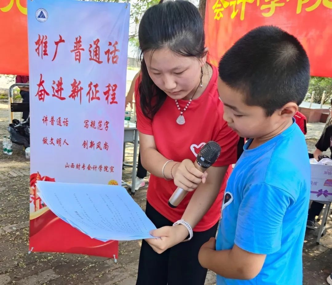 第五站,队员们走进了褚西联合小学。他们将目光聚焦在青少年身上,精心策划并举办了一场别开生面的推广普通话活动,绕口令、诗词吟诵等精彩环节接连上演,让孩子们充分感受到了语言的独特魅力。在家长和队员们的鼓励与引导下,孩子们热情高涨,踊跃参与。他们用流利的普通话勇敢地挑战一关又一关,现场掌声雷动,喝彩声不断。活动结束时,队员们为孩子们送上了精心准备的礼品,激励他们在今后的学习和生活中,更加自信地运用普通话表达内心的想法。