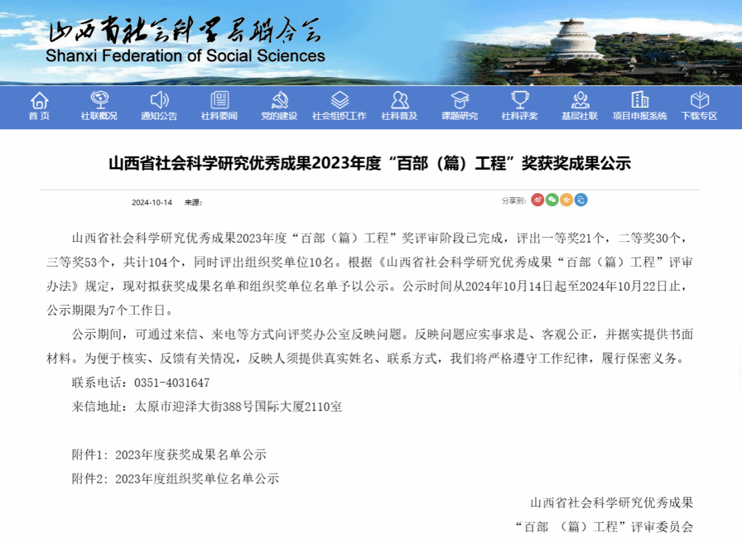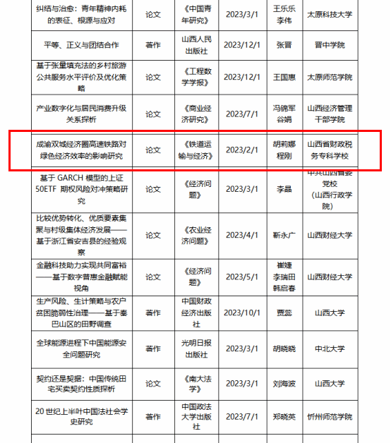 近日,山西省社会科学界联合会公示山西省社会科学研究优秀成果2023年度“百部(篇)工程”奖获奖成果名单。我院教师胡莉娜提交的论文《成渝双城经济圈高速铁路对绿色经济效率的影响研究》荣获三等奖。