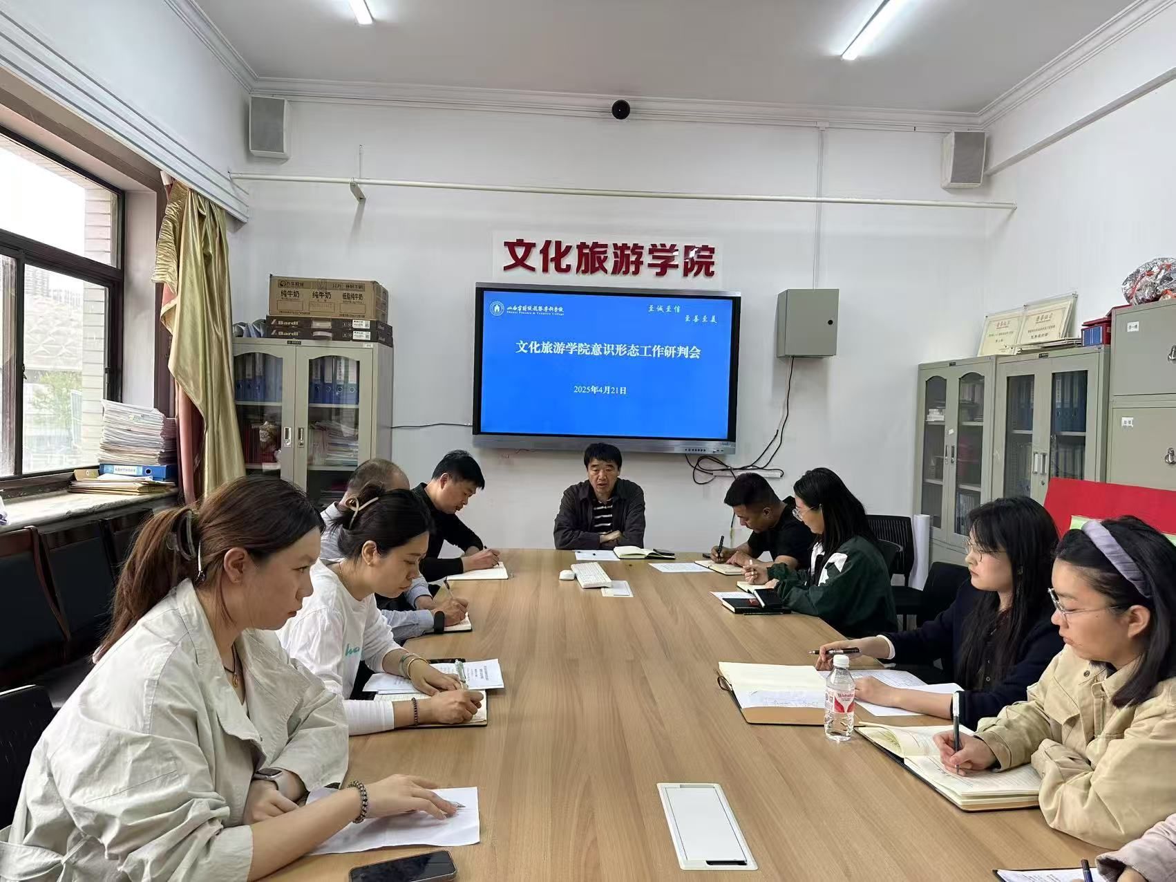 4 月 21 日下午,文化旅游学院党总支在320会议室召开意识形态领域分析研判会。校党委委员、宣传部部长杨虎成,宣传部副部长郭慧斌列席会议,学院全体专兼职辅导员、学生舆情信息员代表参加会议。会议由学院党总支书记张卫主持。