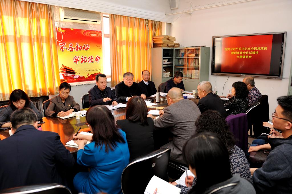 3月22日下午,校党委书记王新淮,党委副书记、校长赵丽生,党委副书记周巧红,党委委员、副校长李锦元,党委委员、学校办公室主任董国富,党委委员、宣传部长郭艳萍等深入马克思主义学院,与全体思政课教师共同学习习近平总书记在思政课教师座谈会的重要讲话精神,并现场调研指导工作。马克思主义学院全体教师参加了调研座谈会。座谈会由马克思主义学院王恩成主持。