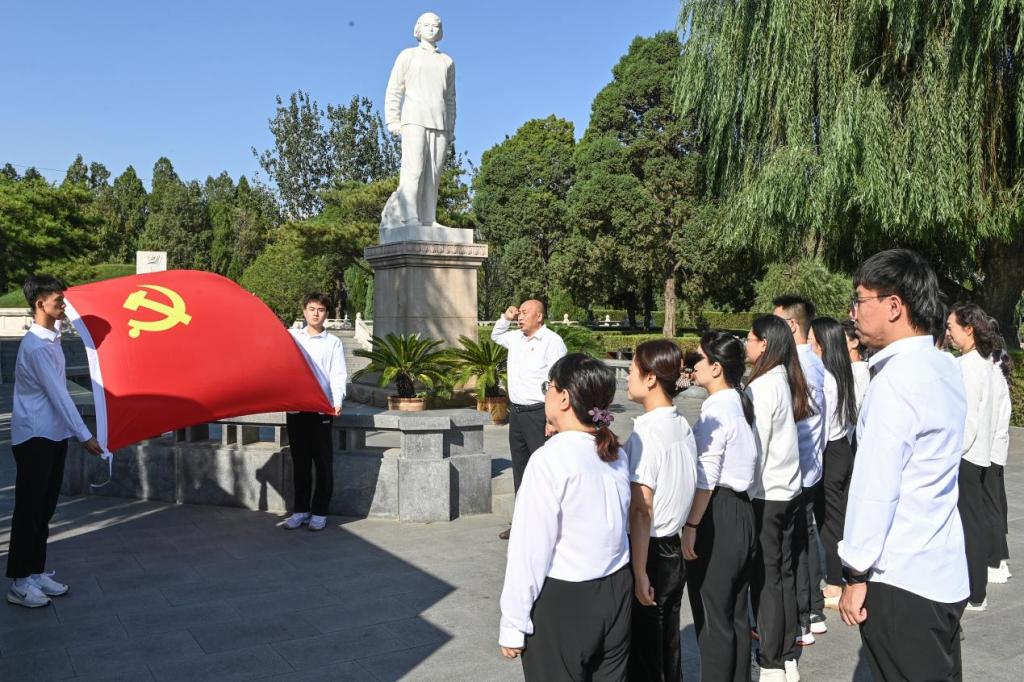 师生来到毛泽东亲笔题词“生的伟大,死的光荣”纪念碑前驻足瞻仰,听取讲解员对刘胡兰革命事迹的详细介绍,并参观馆内珍藏的烈士遗物以及档案文献资料,深切感受刘胡兰烈士为党牺牲的崇高理想和高尚情操。随后,马克思主义学院全体党员面向鲜红的党旗,重温入党誓词,铿锵有力的宣誓声响彻整个纪念馆广场,铮铮誓言表达了全体共产党员对党的无限忠诚和热爱。