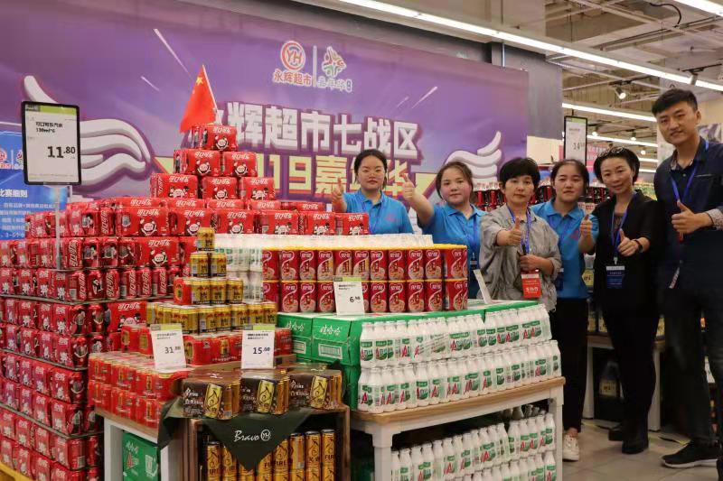 比赛中,我院代表队被分配到饮品类商品四项:娃哈哈AD钙奶、可口可乐、雀巢咖啡和红牛饮料。永辉教练先针对陈列商品的注意事项、陈列要点等进行指导,随后同学们巧妙设计陈列思路、积极进行草图绘制、激烈讨论陈列战术,最终确定堆头主题: 红红火火一家人。经过一个多小时的高效配合,我院代表队将“红红火火一家人”的创意通过四种饮品表达为1.55米×1.55米×1.4米体量见方的陈列组合,并充分调和了红色、绿色、白色及金色等高难度颜色组合。同学们为顾客带来的精彩陈列,创意十足,让人眼前一亮,充分体现出年轻小伙伴们的激情及创新。
