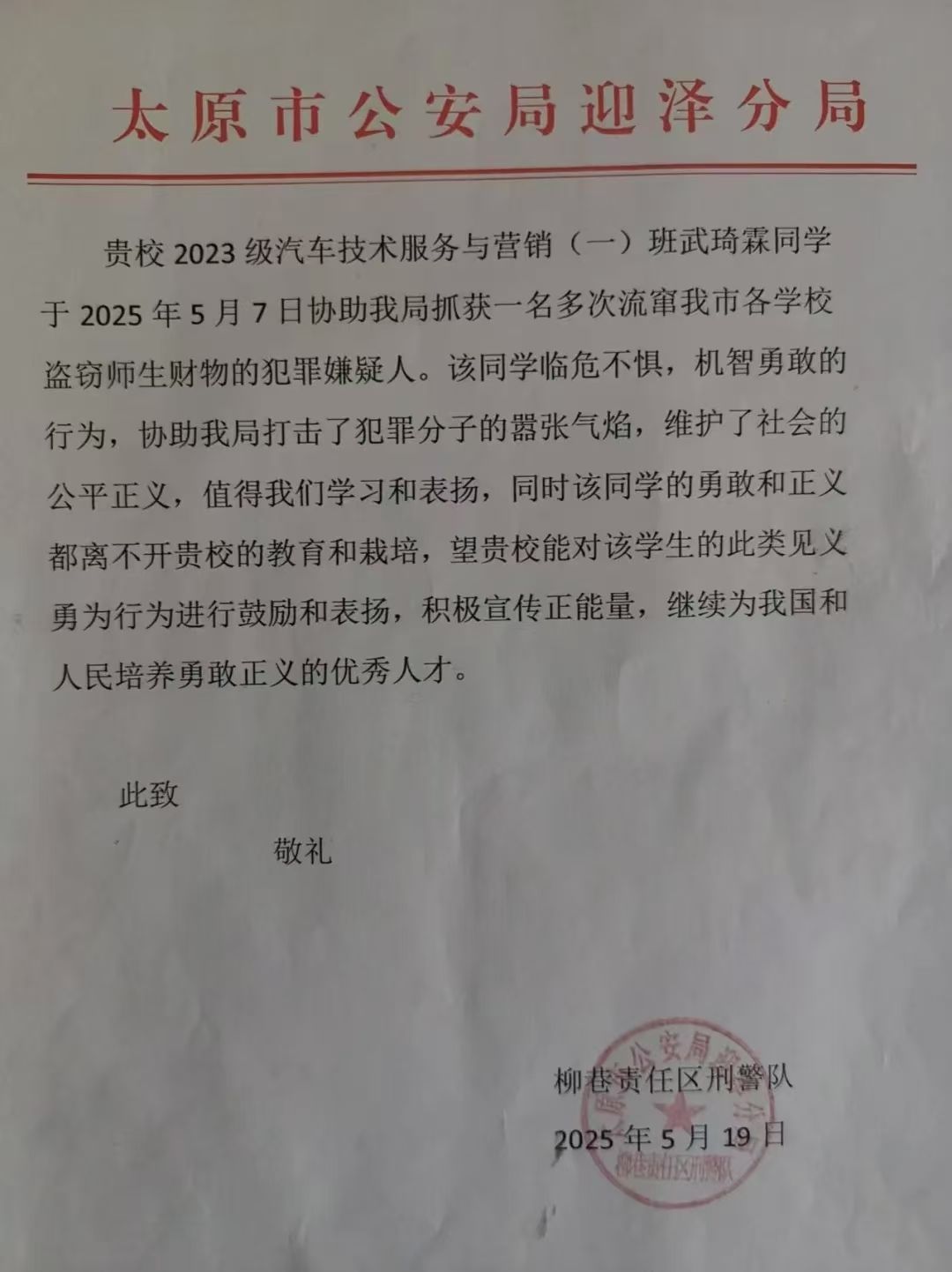 近日,太原市公安局迎泽分局柳巷责任区刑警队给bat365发来感谢信,对bat365数字商务学院学生武琦霖协助民警抓获一名多次流窜我市学校盗窃师生财物的犯罪嫌疑人的行为给予表扬。