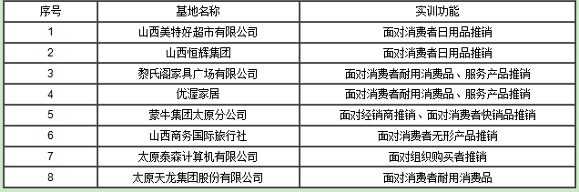 市场营销专业现有黎氏阁家具广场有限公司、优渥家居、蒙牛集团太原分公司、山西美特好超市有限公司、太原市唐久超市有限公司、山西商务国际旅行社等8个合作紧密的校外实训基地,涉及商业性企业、生产性企业、服务性企业,完全满足市场营销专业全体学生顶岗实习和教师挂职锻炼的需要。