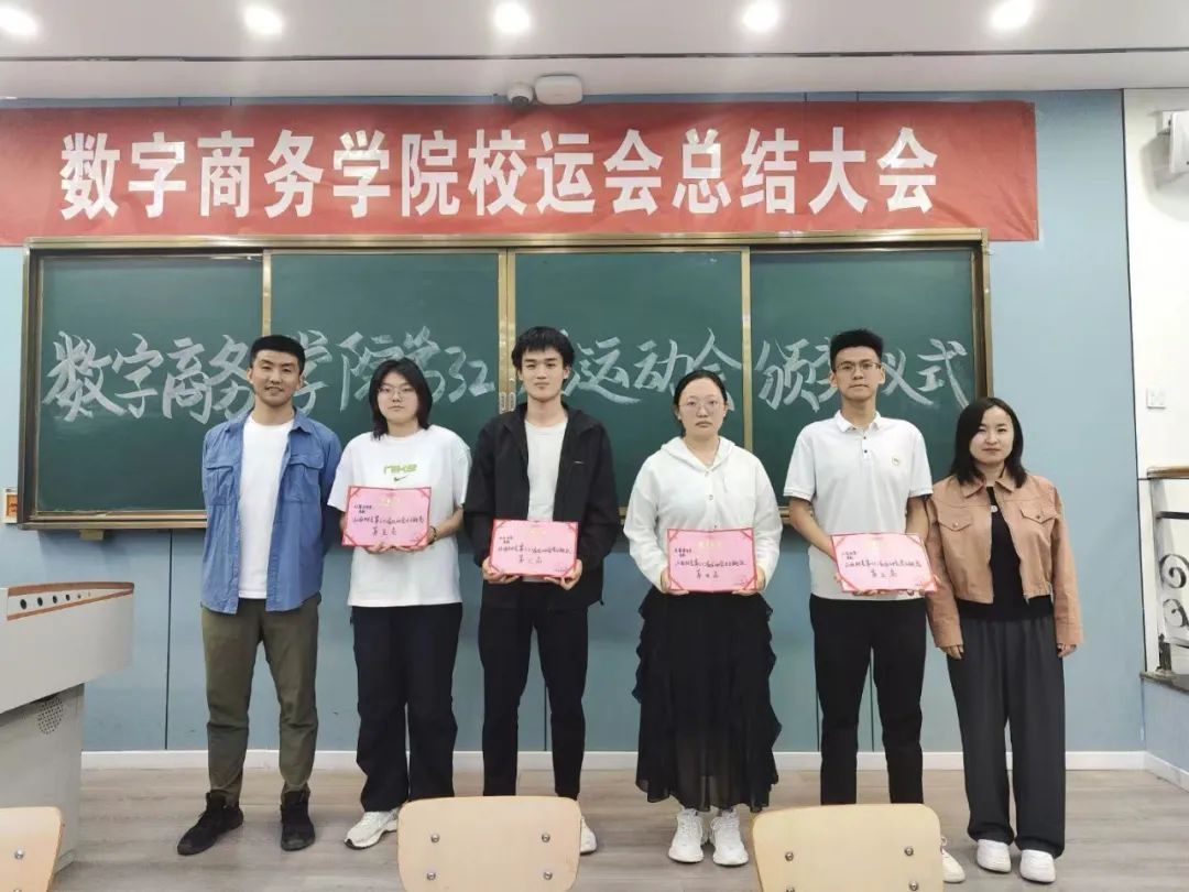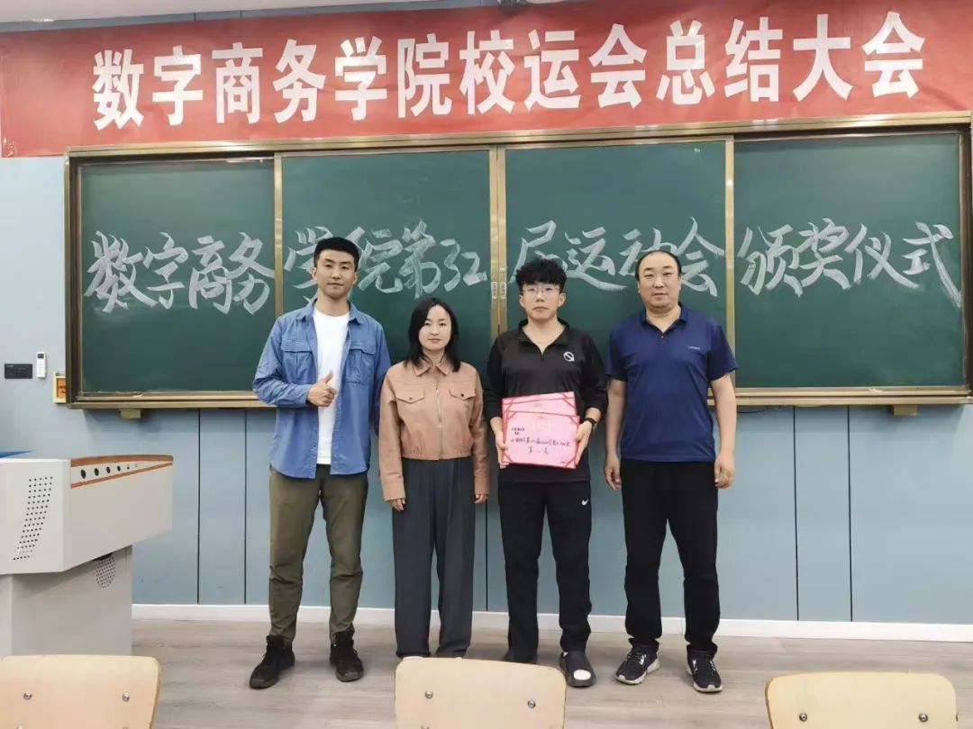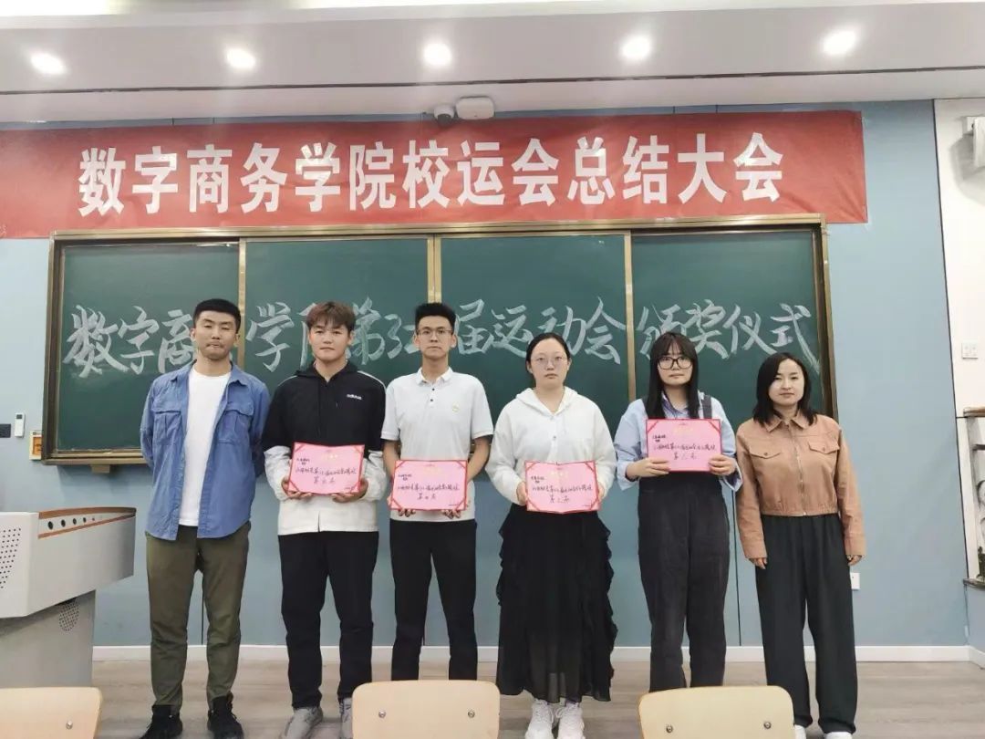 在第三十二届运动会这场激情与实力交织的体育盛事中,数字商务学院的健儿们以昂扬的斗志、无畏的勇气,在赛道上驰骋、在赛场上绽放。最终,他们凭借出色的表现,荣获团体总分第三名、男子团体第二名、阳光体育大赛团体总分第三名、团体操诚信奖的成绩,用奋斗书写下属于学院的荣耀篇章。在颁奖仪式现场,党总支副书记谢斌、分团委书记郝强燕、分团委副书记姬志亮等领导老师出席。为在赛场上奋力拼搏、表现优异的运动员们依次颁发了荣誉证书,共同见证荣耀时刻。