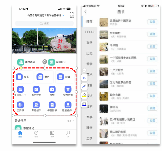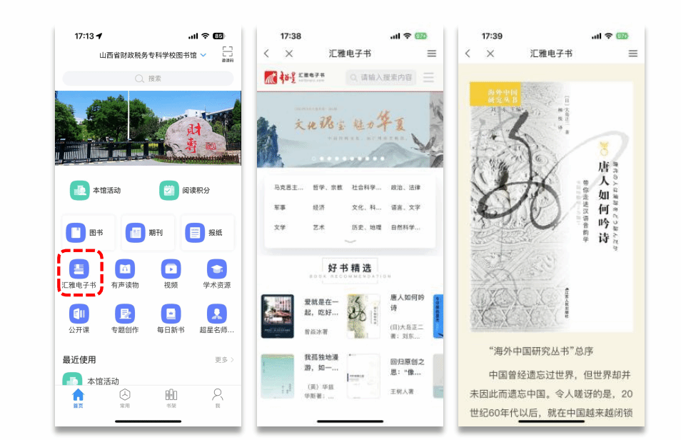 3.超星电子图书移动版:移动图书馆为方便读者使用超星数字图书,上线“汇雅电子书”应用,读者可进入页面查找或选择图书阅读。