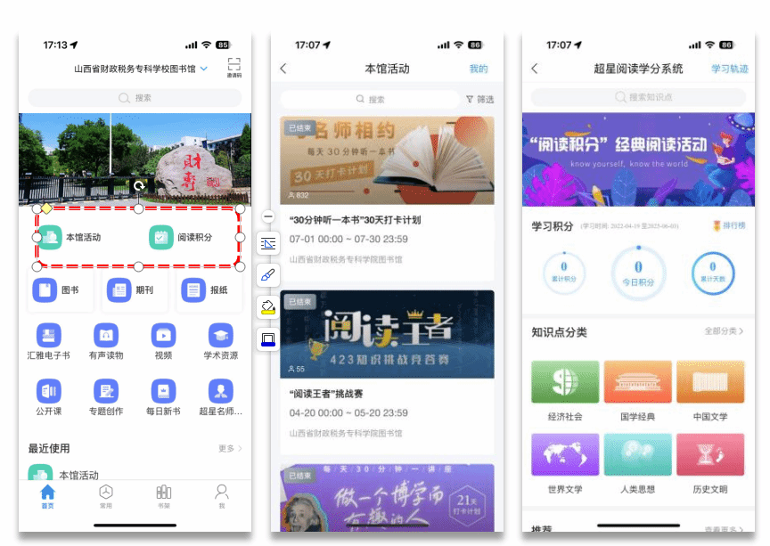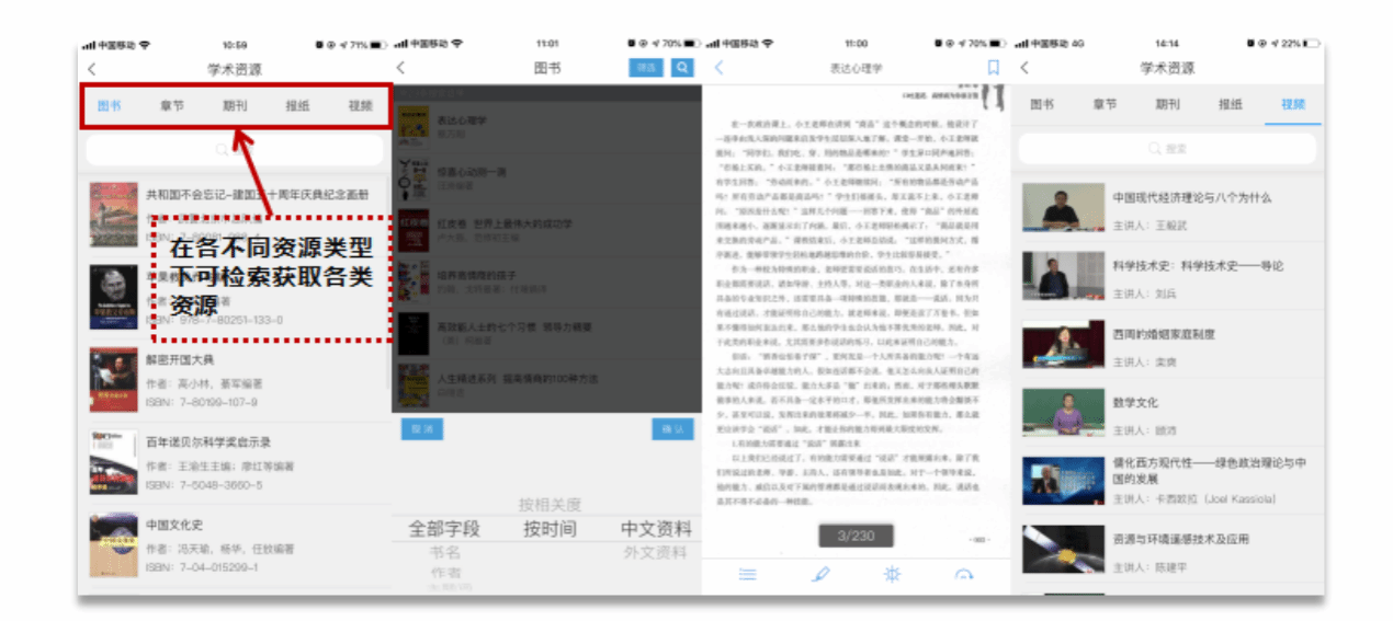 2.各类资源:百万种中文电子图书,400余种报纸,视频2500个系列18400集;音频2013个系列13746集公开课:1037个系列7596集,读者可以直接点击“图书”、“期刊”、“报纸”等即时阅读,进入“学术资源”检索并获取自己所需要的电子资源。