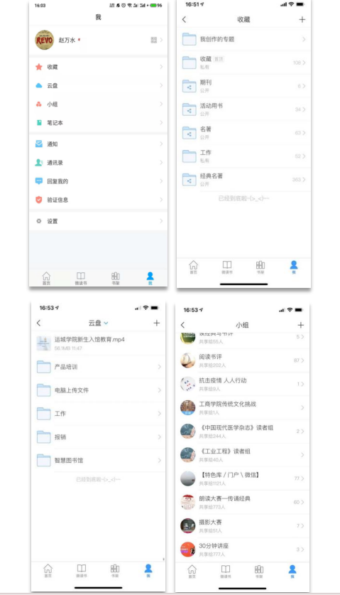 “我”是集中管理读者相关信息的模块。在此模块可以看到读者的收藏的资源、创作的专题、云盘内的资料、加入的小组以及笔记等。