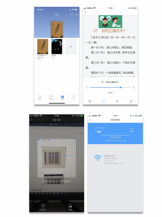 在APP中正在下载或已下载完成的图书都可在“书架”模块查看,APP中任何模块中的图书资源点击下载后都会保存到书架,可随时下载与阅读,且会记录已阅读页数,之后进入可直接跳转至上次阅读页,并对阅读页面进行设置。还可通过扫一扫与WIFI传书进行下载图书。