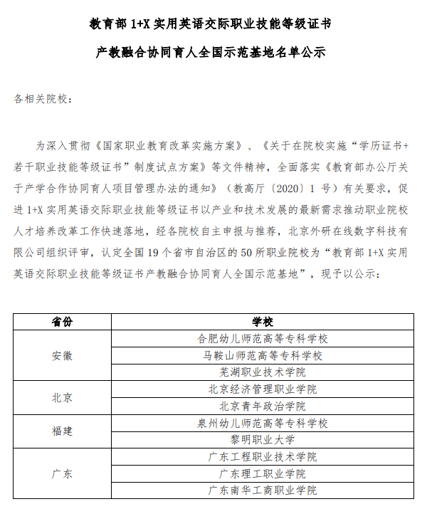 4月14日—15日,以“守正创新,传承超越”为主题的“新时代职业教育外语教学改革与发展论坛”在广东深圳成功举办。会议上,教育部1+X实用英语交际职业技能等级证书(简称VETS)的培训评价组织北京外研在线数字科技有限公司公布了首批“教育部1+X实用英语交际职业技能等级证书产教融合协同育人全国示范基地”(简称VETS基地)的院校名单。首批VETS基地共遴选了全国19个省市自治区的50所职业院校,以此表彰各院校在1+X证书制度试点工作、“岗课赛证” 改革研究与实践、产教融合协同育人模式、“双师型”师资队伍建设等方面领航VETS特色职教体系的突出贡献。